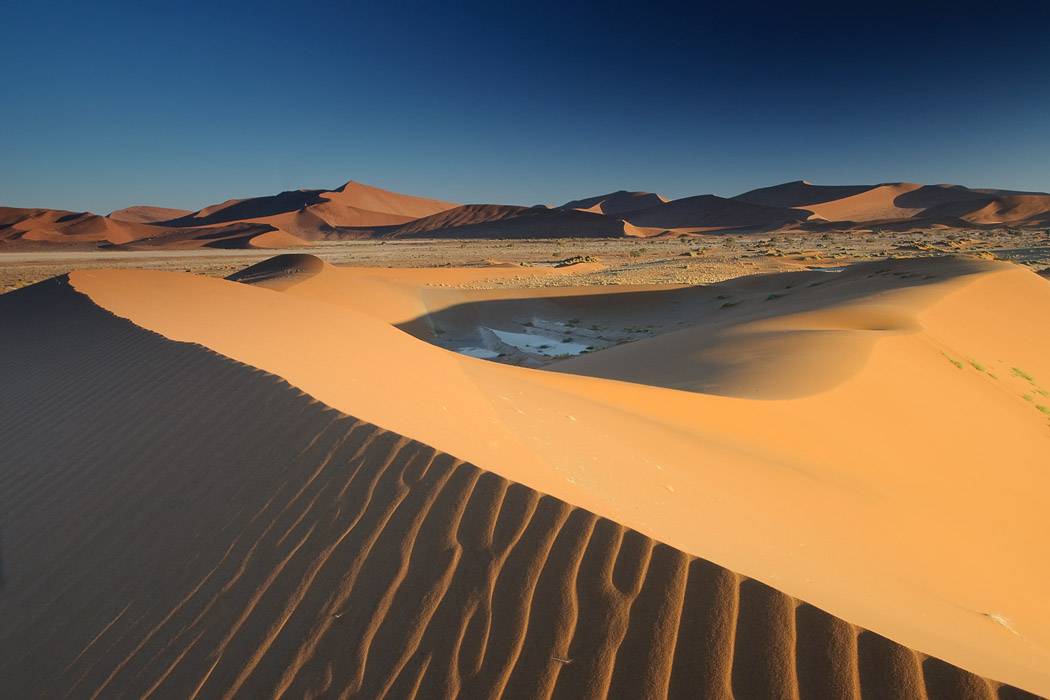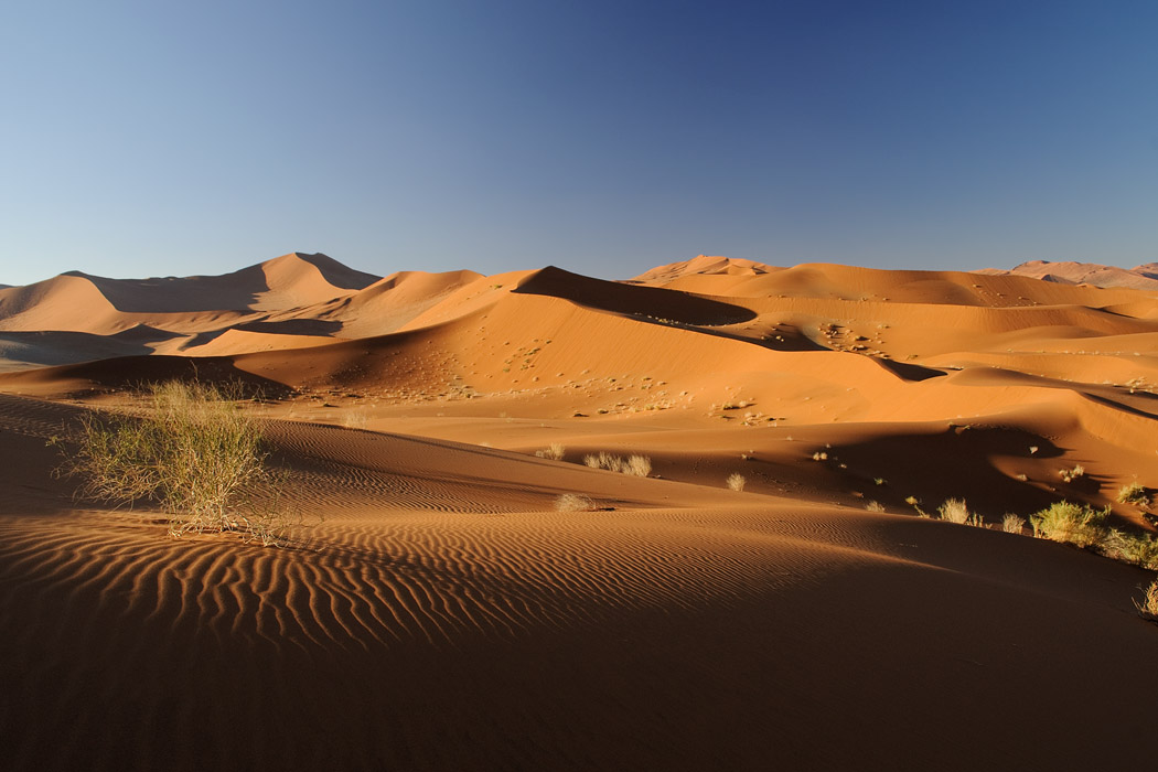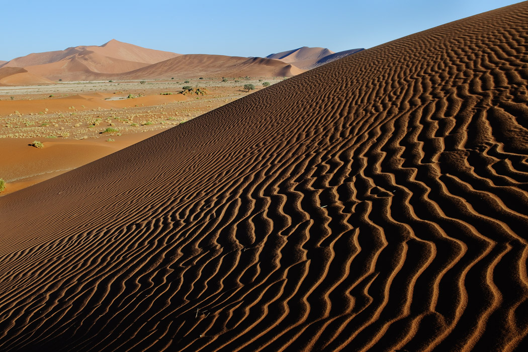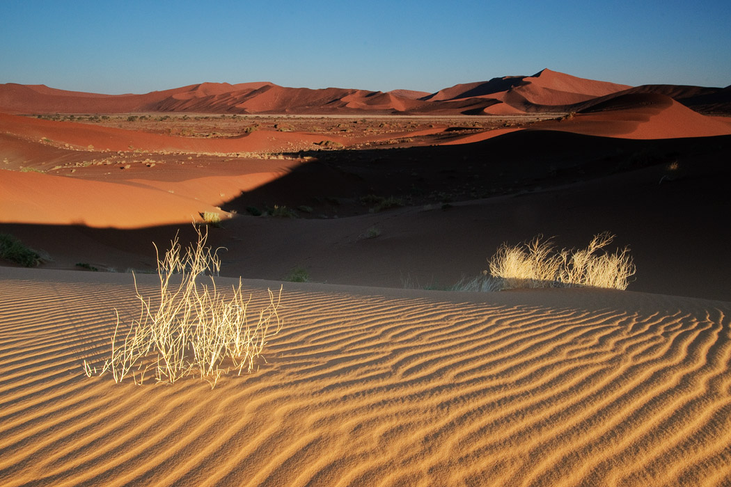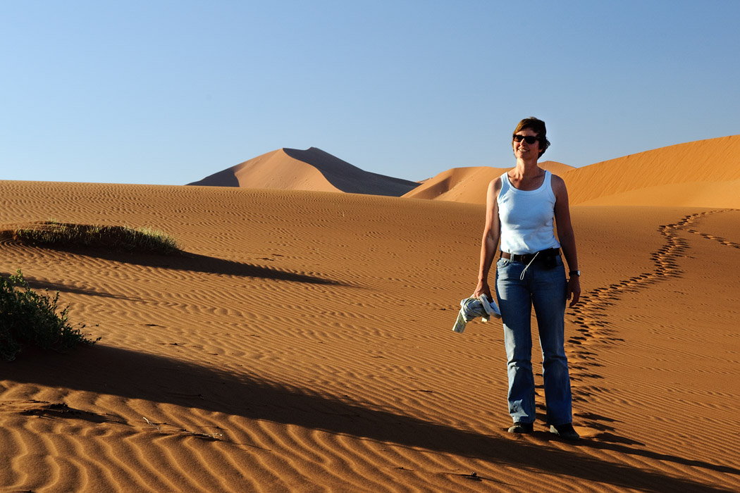 Es ist zwar immer noch windig, aber die Sicht ist gut. Wir fahren ohne Probleme bis an die Sossussvleidüne heran, nehmen jedoch eine Düne dahinter. Dort gibt es keine Fußspuren und man hat schon nach sehr kurzem Aufstieg das Gefühl ganz weit weg von allem zu sein. Während Uwe dem ultimativen Wüstenbild hinterherjagt, genieße ich die abendliche Stimmung, den Wind, die Wellen im Sand und die Strauße, die im Tal herumlaufen. Mein Roman ist auch interessant und die Zeit bis zum Sonnenuntergang vergeht wie im Flug.