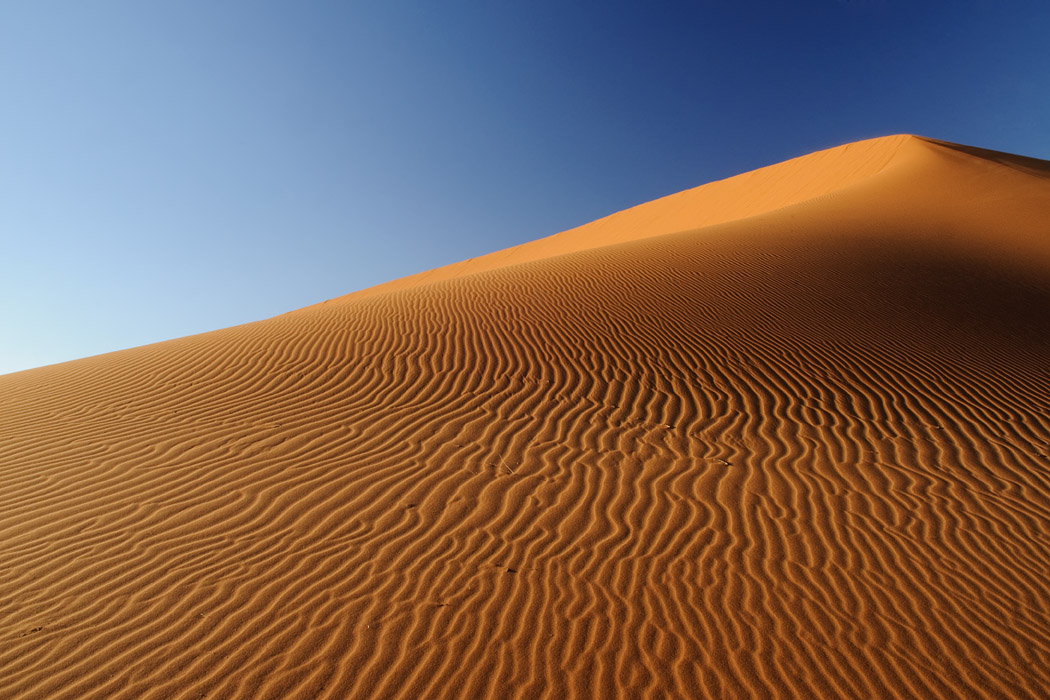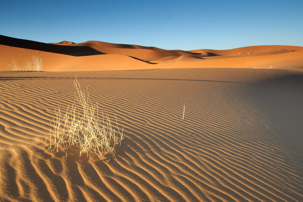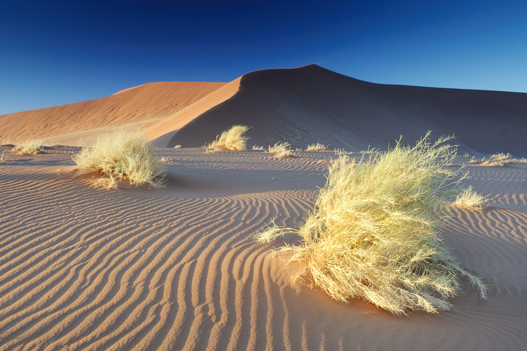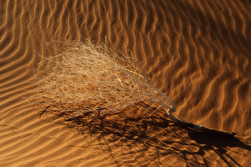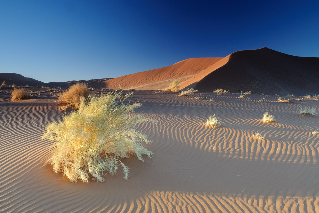 Es ist zwar immer noch windig, aber die Sicht ist gut. Wir fahren ohne Probleme bis an die Sossussvleidüne heran, nehmen jedoch eine Düne dahinter. Dort gibt es keine Fußspuren und man hat schon nach sehr kurzem Aufstieg das Gefühl ganz weit weg von allem zu sein. Während Uwe dem ultimativen Wüstenbild hinterherjagt, genieße ich die abendliche Stimmung, den Wind, die Wellen im Sand und die Strauße, die im Tal herumlaufen. Mein Roman ist auch interessant und die Zeit bis zum Sonnenuntergang vergeht wie im Flug.