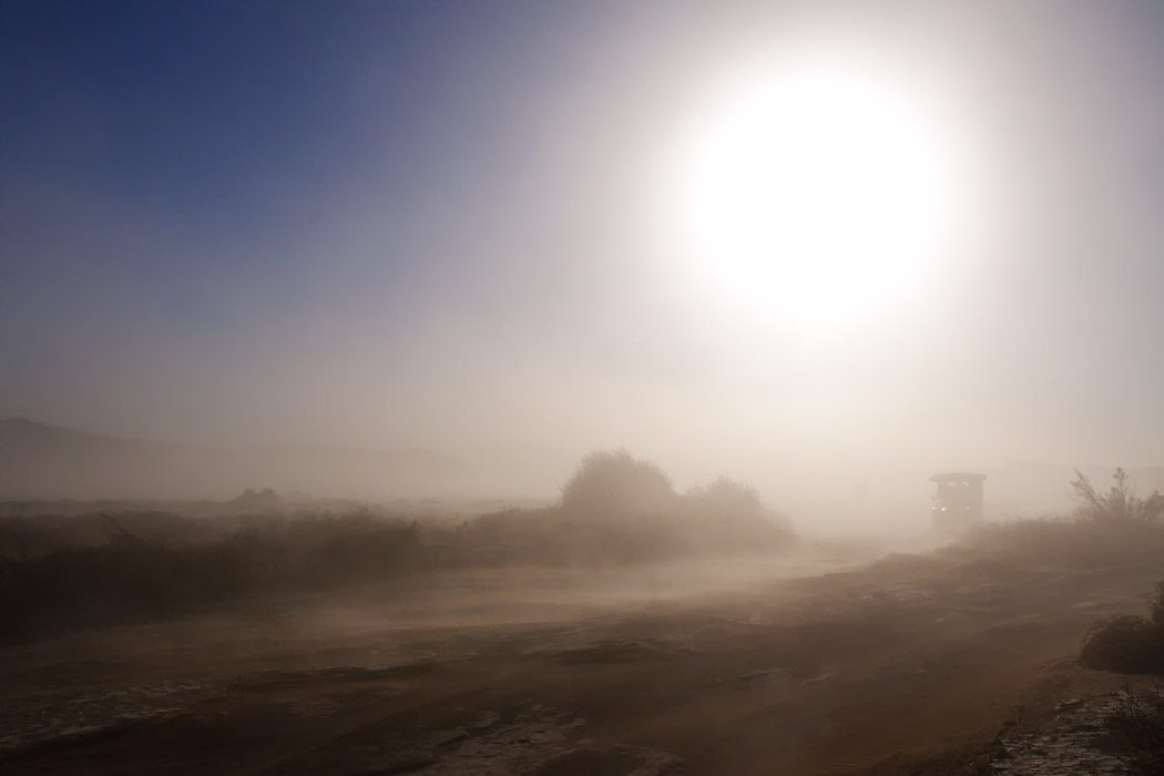 Als wir zum Auto zurückkommen, können wir vielleicht noch 20 m weit gucken. Ein Glück, dass wir uns auf bekanntem Gebiet befinden. Wir finden den Weg zurück, obwohl man kaum noch Spuren erkennen und auch andere Autos fast nicht mehr sehen kann.