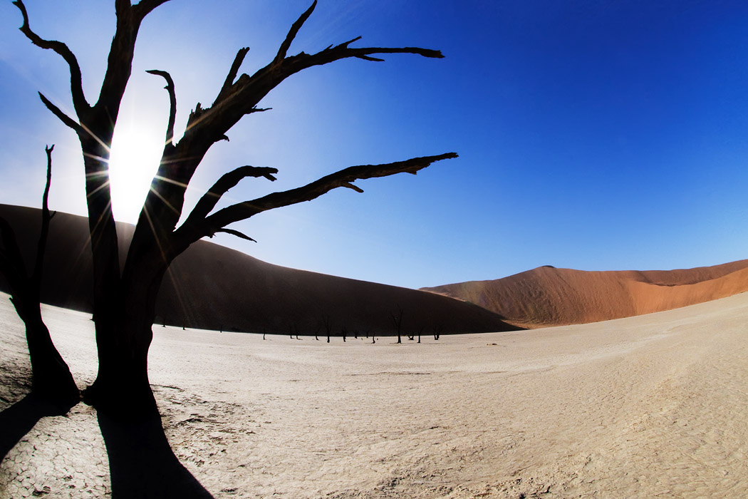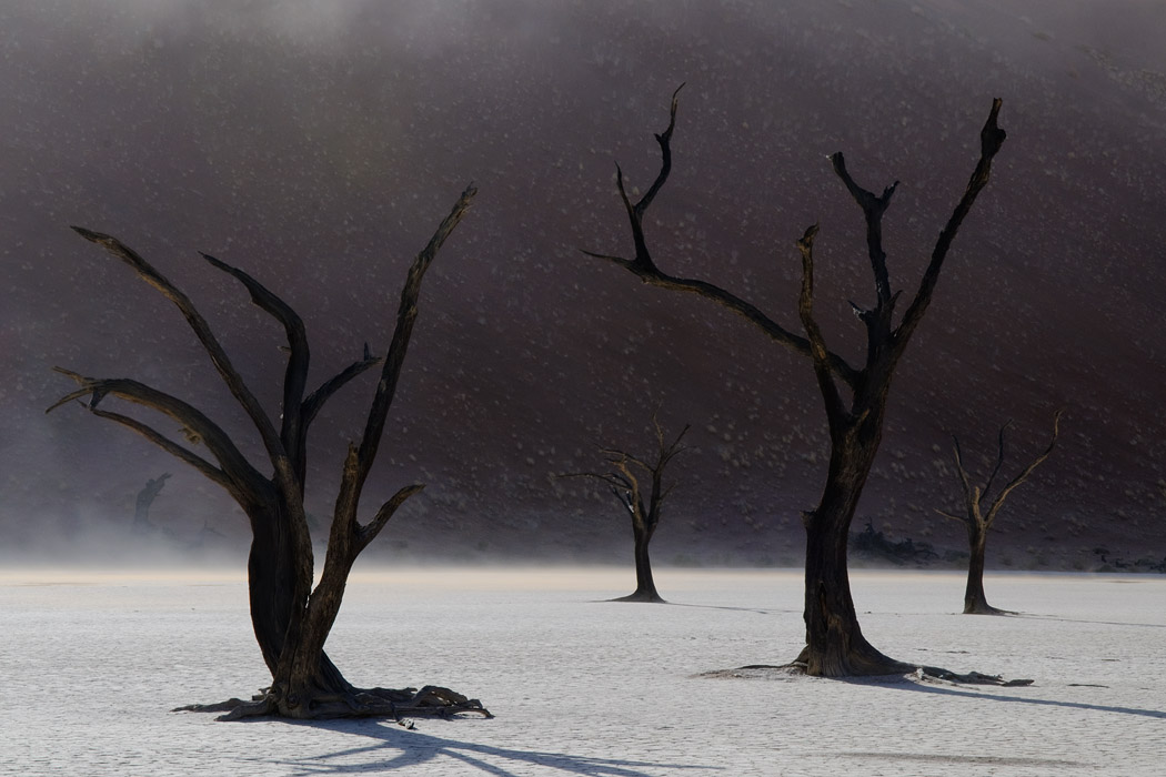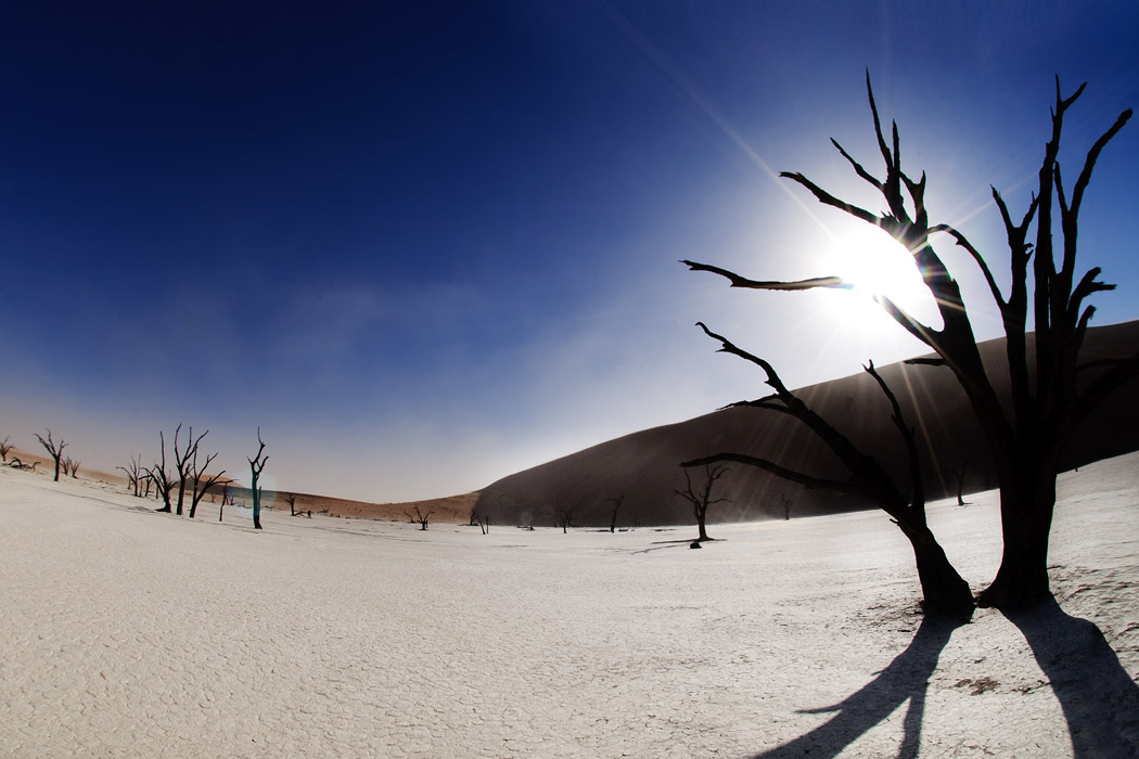 Um 5.15 Uhr stehen wir mit aufgebrühtem Cappuccino in der Hand am Tor. Die Wärterin schreibt in aller Ruhe alle Autos auf und öffnet das Tor um eine Minute verspätet. Vorschriftsmäßig schleichen wir in den Park. Nach ca. 30 km wird es allen zu blöd und die Überholmanöver setzen ein. Am 1. Großen Parkplatz angekommen, mummeln wir uns ein, um uns gegen den Wind und den herumfliegenden Sand zu schützen. Es ist noch recht frisch und forschen Schrittes laufen wir in Richtung des „Hidden Vleis“. Der Weg ist gekennzeichnet, recht flach und gut zu gehen. Langsam geht die Sonne auf. Das Vlei selbst ist dann eine Enttäuschung. Das Dead Vlei erscheint uns viel reizvoller. Also gehen wir zurück, passieren die Allradstrecke ohne Probleme und laufen ins Deadvlei. Inzwischen hat der Wind allerdings noch einmal zugelegt. Man kann von Parkplatz des Dead Vleis die Sossusvleidüne vor lauter fliegendem Sand nicht sehen.