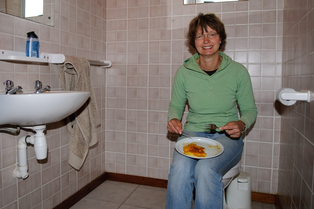 Die Nacht verläuft wieder sehr unruhig, da es so stürmt und so warm ist. An diesem Morgen kann man fast gar nichts mehr sehen. Der Sand steht in der Luft. Unser Tisch ist voll Sand, im Toilettenhäuschen ist alles mit einer feinen Sandschicht bezogen. Unsere Aktion Pancakes zu backen verläuft mit einigen Widerständen. Alles muss vor dem fliegenden Sand geschützt werden. Der Teig wird mit einem Teller bedeckt, ich stehe direkt vor der Pfanne, damit kein Sand hereinfliegt. Uwe ist den ersten Pancake im Toilettenhäuschen auf dem Klo sitzend. Dann löst er mich ab und ich esse drinnen. |