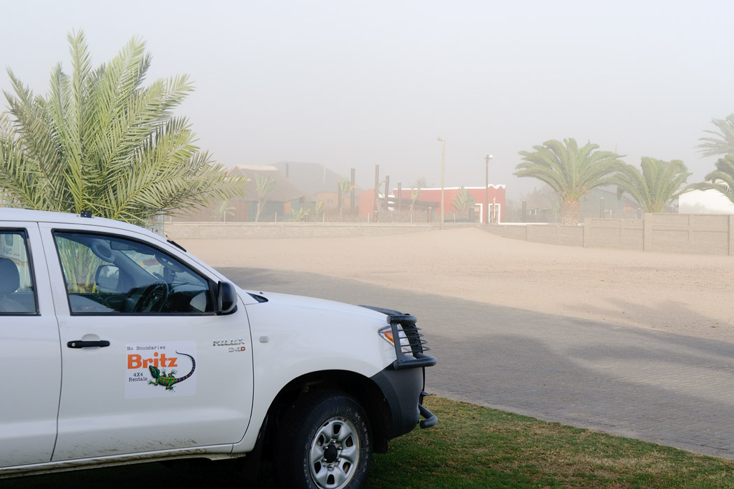 Uwe packt einige wenige Fotoutensilien in einen Rucksack, um Swakopmund zu fotografieren. Ich setze mich ins überhitzte Auto und schreibe. Wir hoffen, dass der Rundflug heute Nachmittag eine gute Sicht bringen wird.