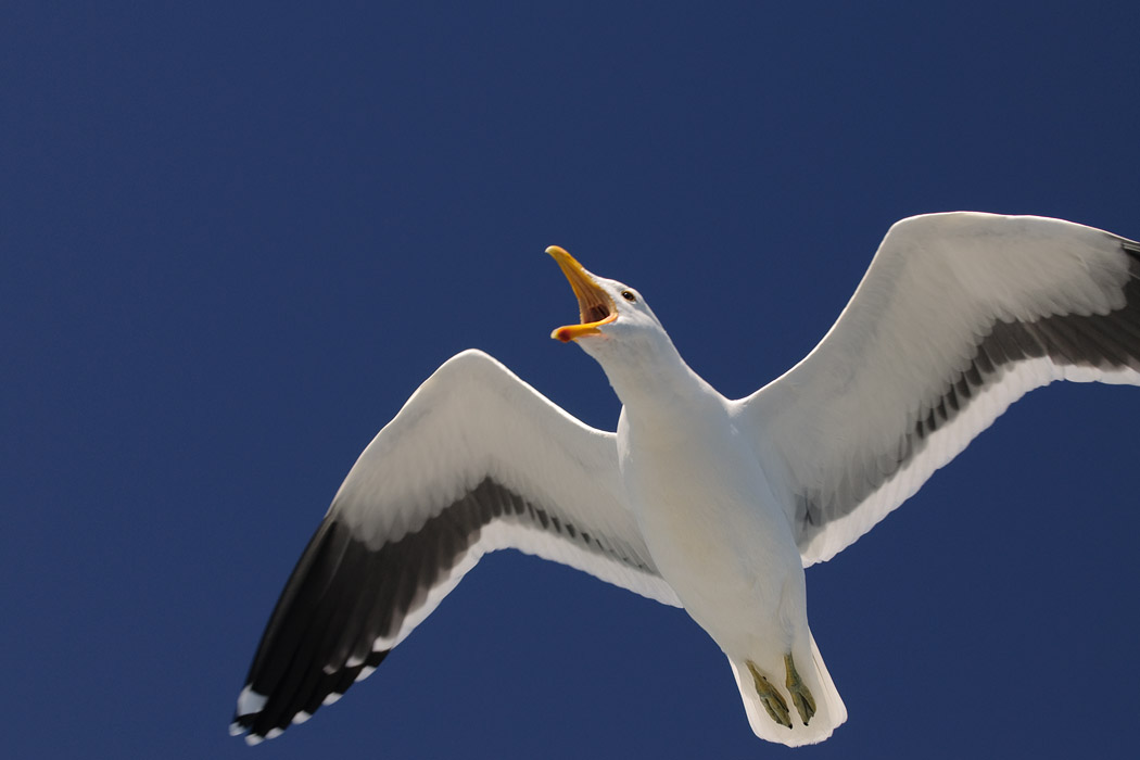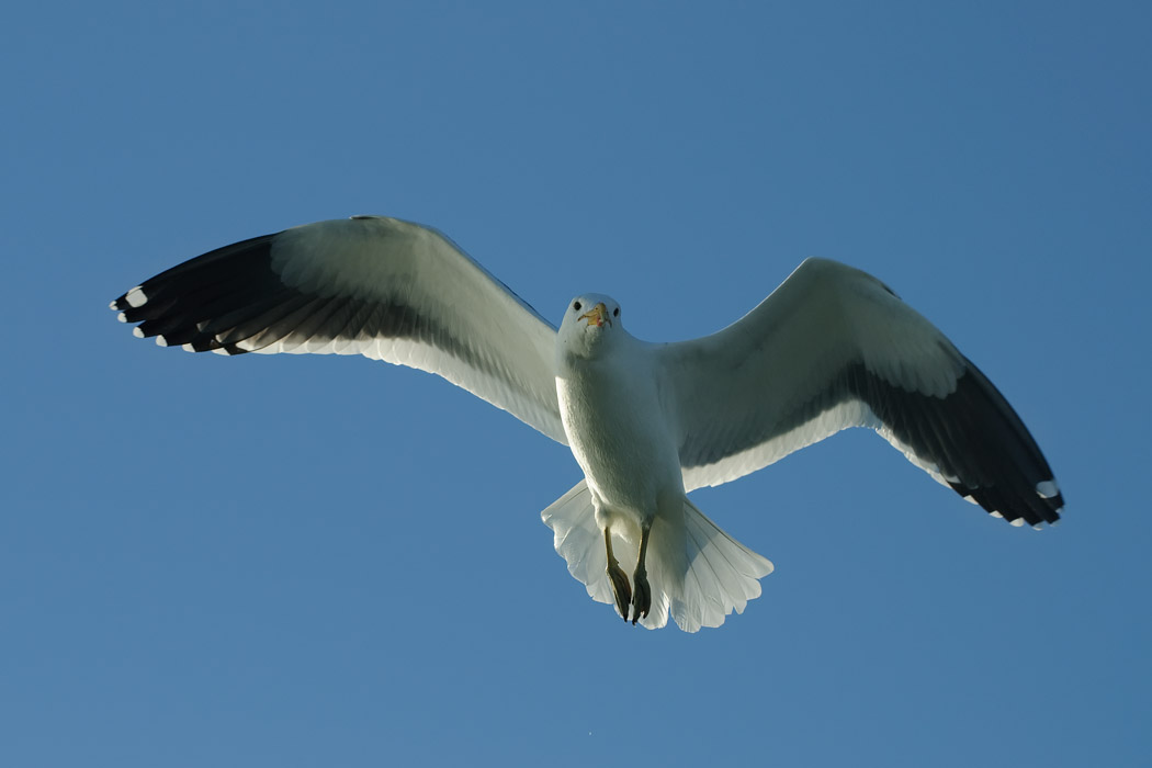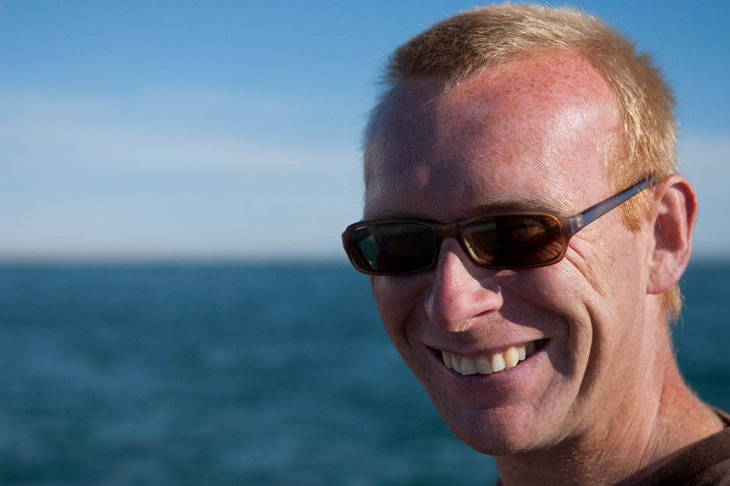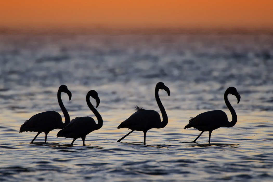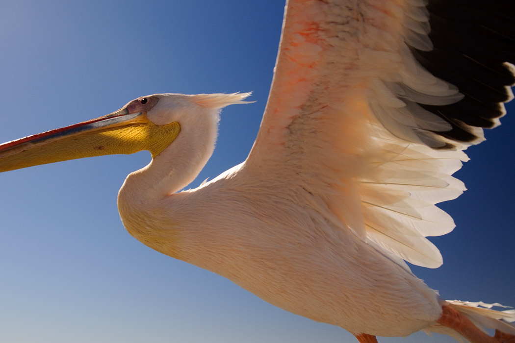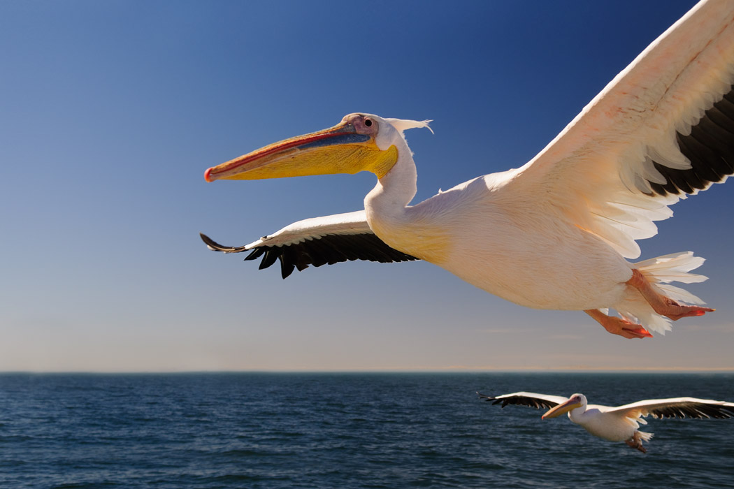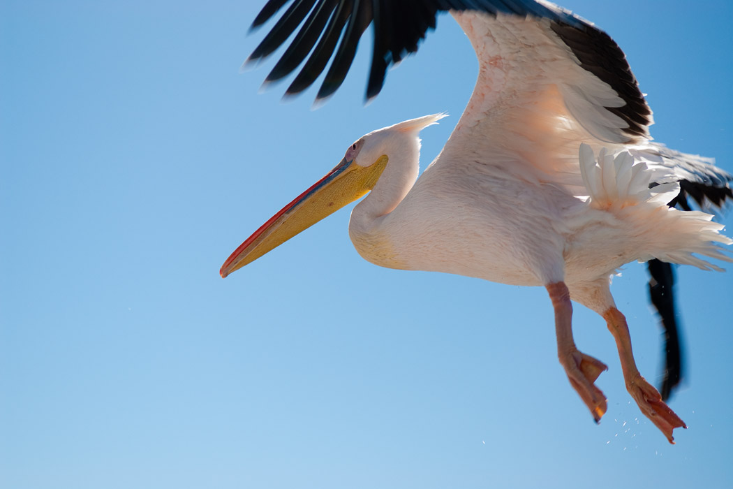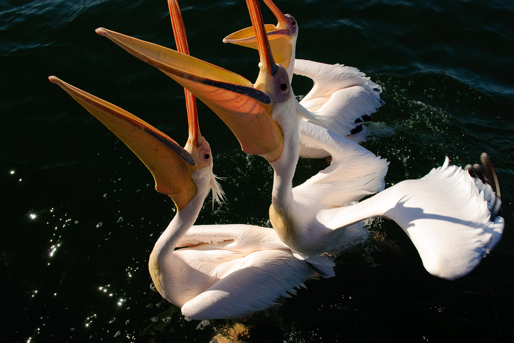 Ganz zum Schluss macht unser Kapitän noch einen Schwenker zu den Pelikanen. Sie sind aber satt und bewegen sich nicht mehr auf das Schiff zu. Die erträumten Flugbilder im Sonnenuntergang kann Uwe so leider nicht mehr schießen.