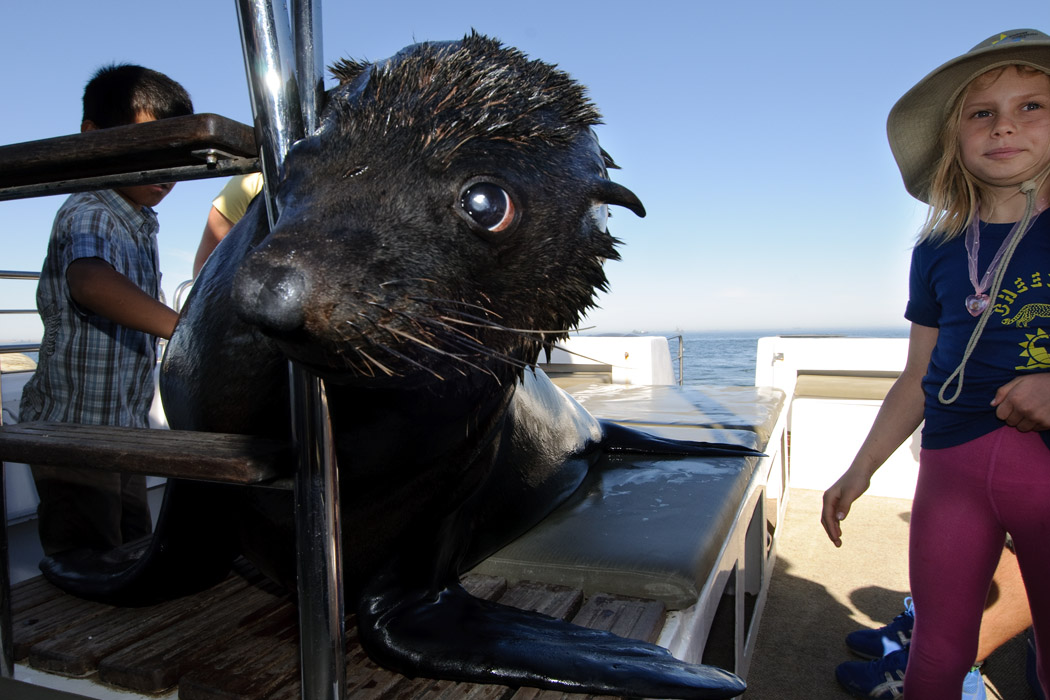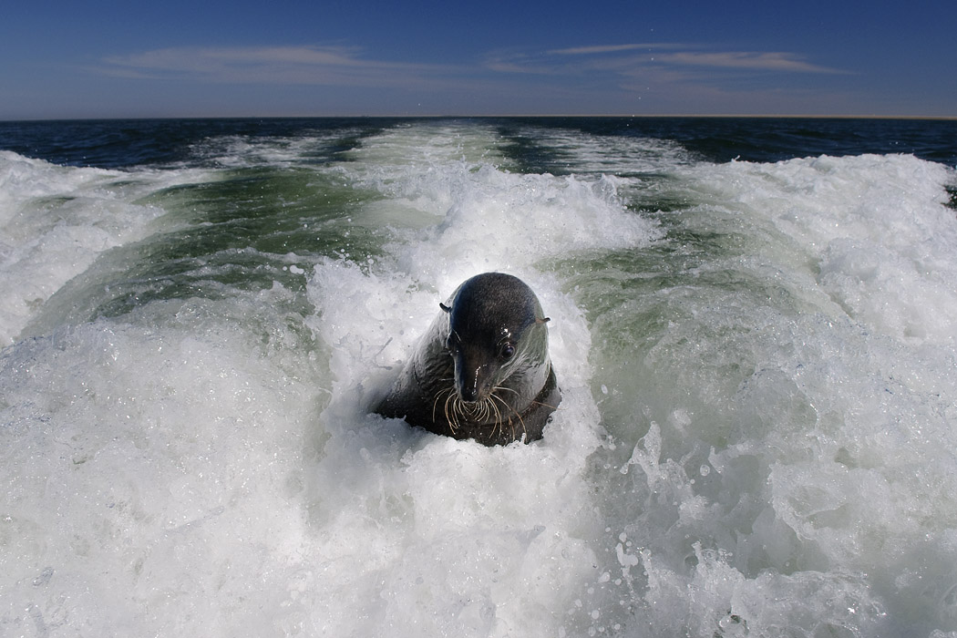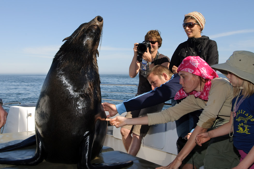Die Bootstour findet auf einem "Schnellboot" statt. Ungefähr 15 Gäste und ein Deutsch sprechender Kapitän machen sich auf, die Bucht zu erkunden. Möwen verfolgen uns, Pelikane werden durch Fische, die der Kapitän hochhält, angelockt. Viele Robben schwimmen im Meer. Eine davon hält sich im Heckwasser des Schiffes und guckt immer wieder neugierig, was da so los ist. Der Kapitän öffnet die Badeleiter und die Robbe springt an Bord. Das ist schon eindrucksvoll, wie so ein großes Tier sich bewegen kann. Die Robbe lässt sich wie eine Diva bewundern, streicheln und fotografieren. Eine nette Vorstellung!!