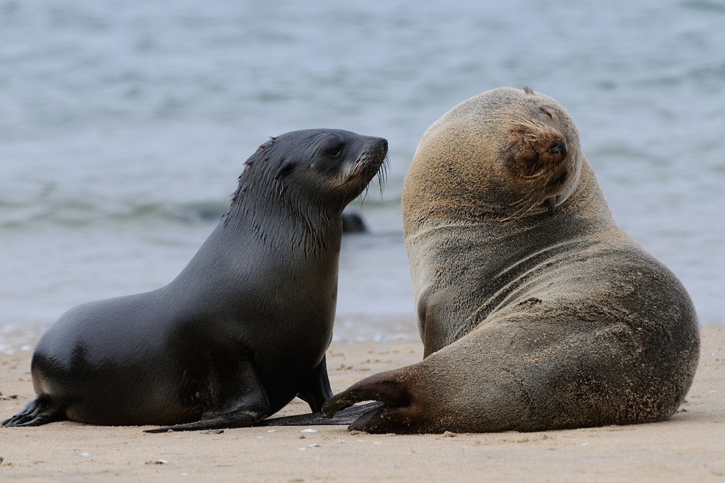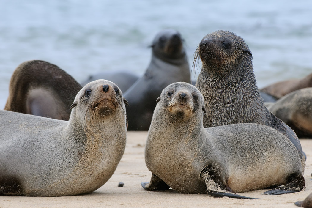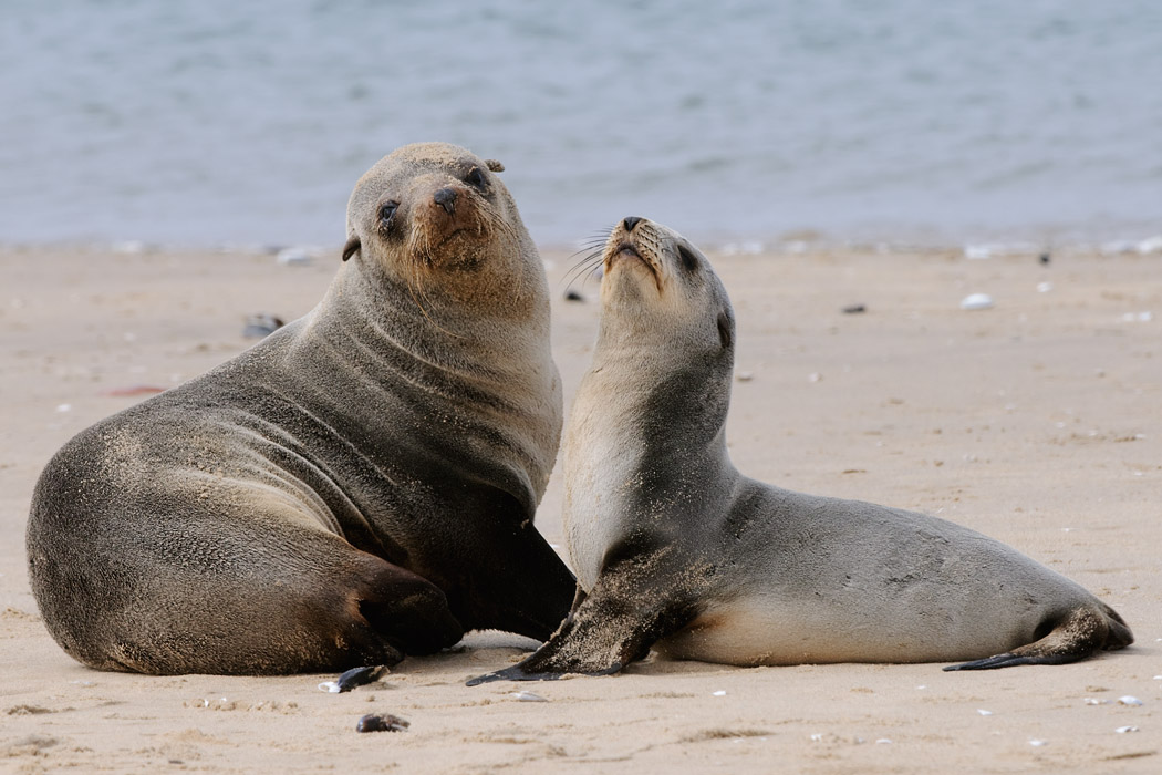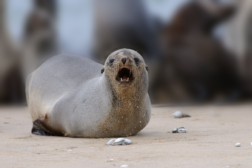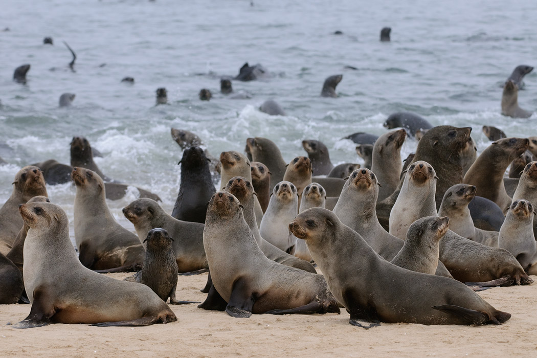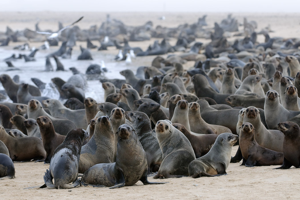 Wir fahren nach Walvisbay und vereinbaren eine weitere Pelikantour für den Nachmittag. Dann machen wir uns auf die Socken, um auf die Landzunge gegenüber zu fahren. Wir bewegen uns in bereits ausgefahrenen Spuren, denn die Landzunge ist recht sandig. Der Nebel gewinnt auch hier die Oberhand und man kann eigentlich kaum noch was sehen. Nach 30km Sandpiste bzw. fahren nach GPS sehen wir einige Landrover am Ufer stehen. Ein paar Kajakfahrer machen sich bereit, um zwischen den Seerobben zu paddeln.