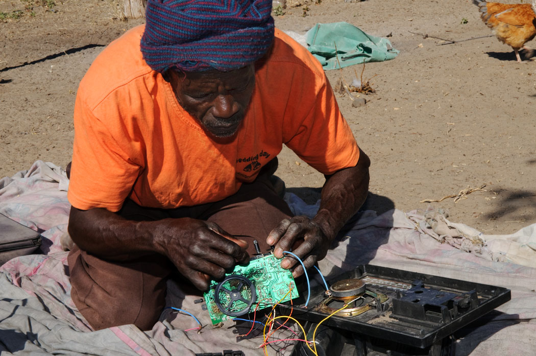 Zu Beginn der Gravelroadgibt es am linken Straßenrand eine kleine Hütte, an der ein altes Pärchen lebt. Sie flicht Körbe und er repariert gerade sein Radio. Wir schauen uns die Körbe an, die klein aber sehr schön sind. Beim Verhandeln bleibt die gute Frau sehr energisch bei ihrem Preis von 200 Pula. 22 € für einen Korb, den es bei Tews & Co für 5€ made in Taiwan gibt, erscheint uns dann doch zu viel. Schließlich sagt sie, 100 Pula und ein T-Shirt. Doch leider haben wir keine T-Shirt zu verschenken. Oder meinte sie 130 Pula? Dies lässt sich jedoch nicht aufklären. Wir lachen viel, kaufen dann schließlich 2 Körbe für insgesamt 200 Pula. Uwe S. findet dann noch eine unbeutzte Batterie, die er dem alten Mann schenkt. So hoffen wir, dass alle zufrieden sind.