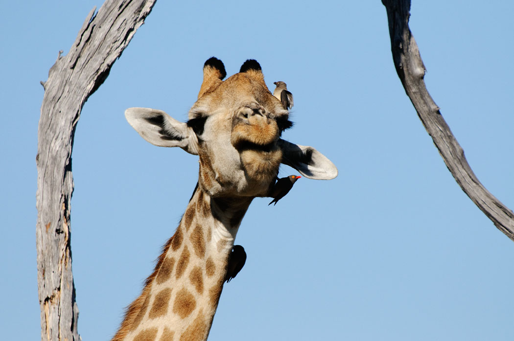 Später verweilen wir lange bei drei Giraffen, die mit viel Inbrunst an einer Frucht rum kauen. Der Kopf der einen Giraffe erscheint wie eingerahmt, da sie ihn so hält, dass er genau zwischen Astzweigen zu sehen ist.