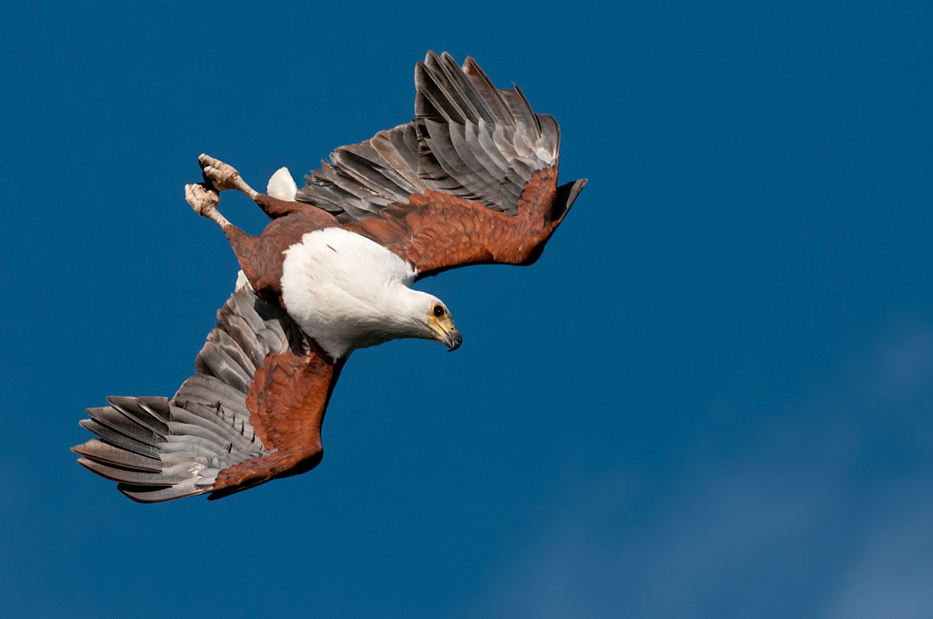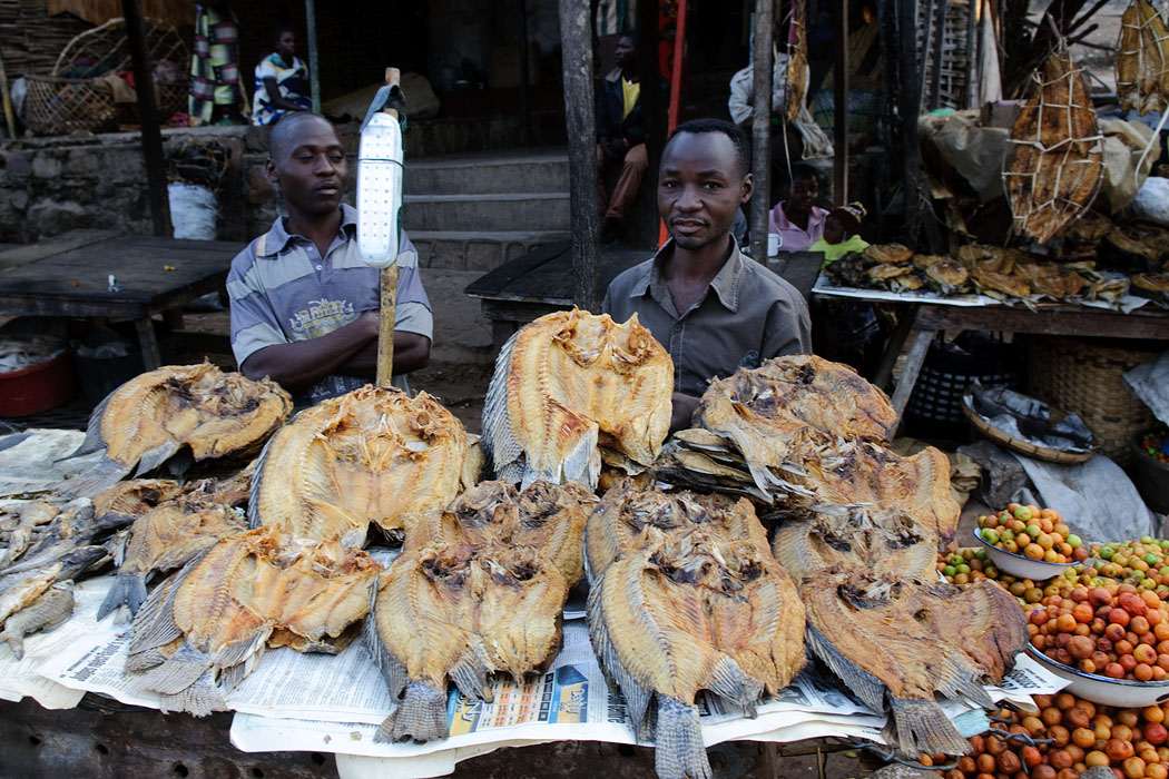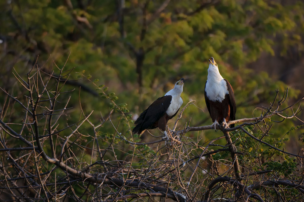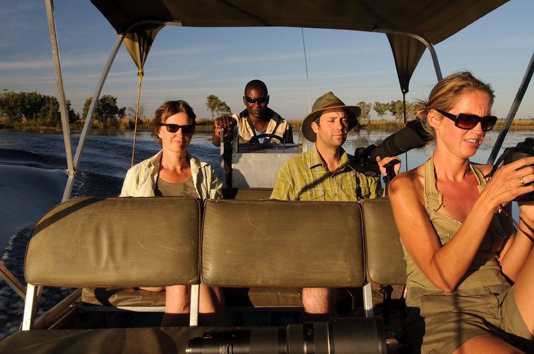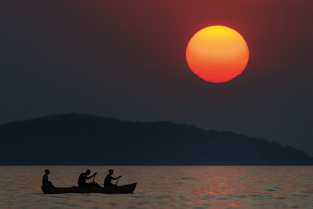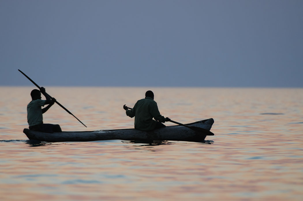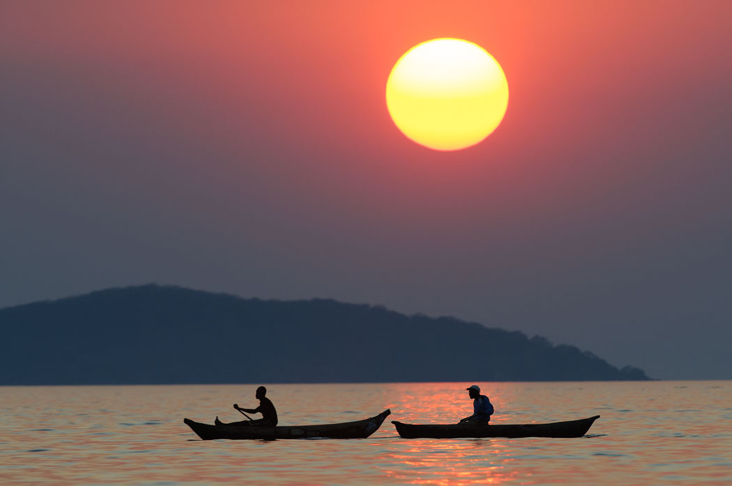 Die Mittagspause erscheint jetzt kurz, da wir um 16.00 Uhr wieder auf Adlerfotosafari gehen. Leider gelingt es uns auch jetzt nicht, die perfekten Fotos zu schießen. Es ist trotzdem schön, auf dem Schiff zu sein und den Sonnenuntergang zu genießen. Die Fische für den nächsten Tag kaufen wir bei Fischern, die mit ihren Mokoros unterwegs sind. Leider nehmen sie sofort mehr Geld, wenn wir dabei sind. Der Fisch ist gleich doppelt so teuer, als wenn ein Einheimischer die Fische kauft.