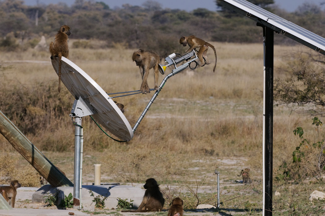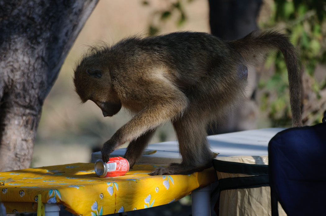 Dabei beobachte ich, wie sie sich an einen verlassenen Wohnwagen heranmachen. Da werden die Coladose zum Spielzeug, das Dach zur Terrasse, und der Bezug des Ersatzreifens auf seine Haltbarkeit hin überprüft. Ein Pavian bekommt sogar den Klettverschluss des Zeltes auf und zieht den Reißverschluss ein Stück nach oben. In diesem Moment verjagen wir ihn jedoch, denn es kann ja nicht sein, dass die Affen dem Innenleben des Zeltes einen Besuch abstatten. Vor diesen Tieren ist wirklich nichts sicher!! |
