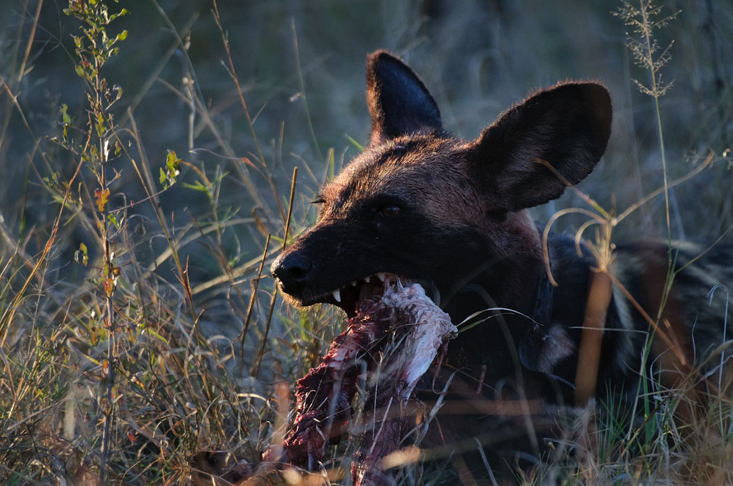 Beim Losfahren am nächsten Morgen, entdecken wir Spuren im Sand auf der Straße. Wir folgen ihnen und sehen direkt zwischen dem Flughafen und der Rangerstation 4 Hyänenhunde, die ein Wild gerissen haben. Wir können nicht mehr erkennen, was es für ein Tier gewesen ist. Sie reißen daran, fressen dann und kämpfen wieder darum. Wir verlassen die Straße, um bessere Fotos machen zu können, ohne dass die Tiere es überhaupt nur zur Kenntnis nehmen. Nach ca. 5 Minuten erscheint auf unserer rechten Seite ein Rangerauto und der Ranger selbst winkt. Wir gucken angestrengt zur anderen Seite und beachten ihn nicht. Er blinkt auf, er gestikuliert. Wir fotografieren weiter.