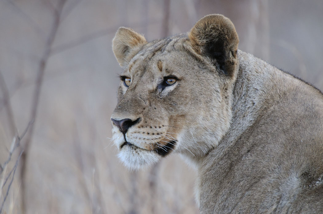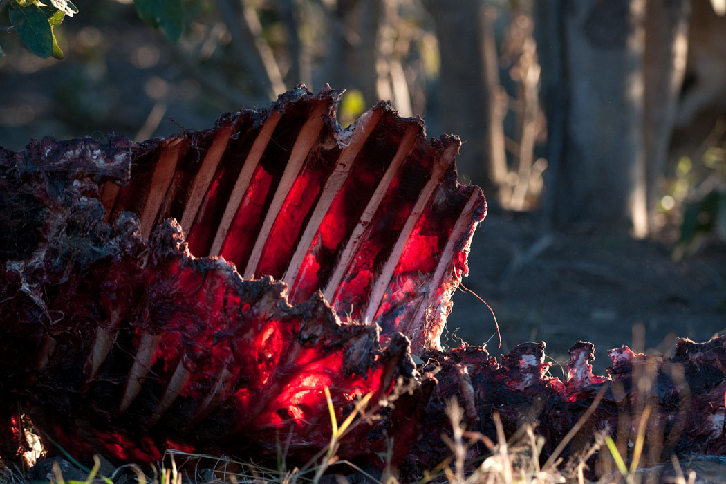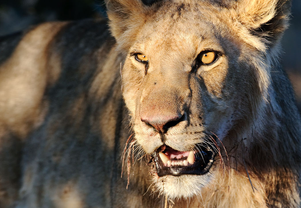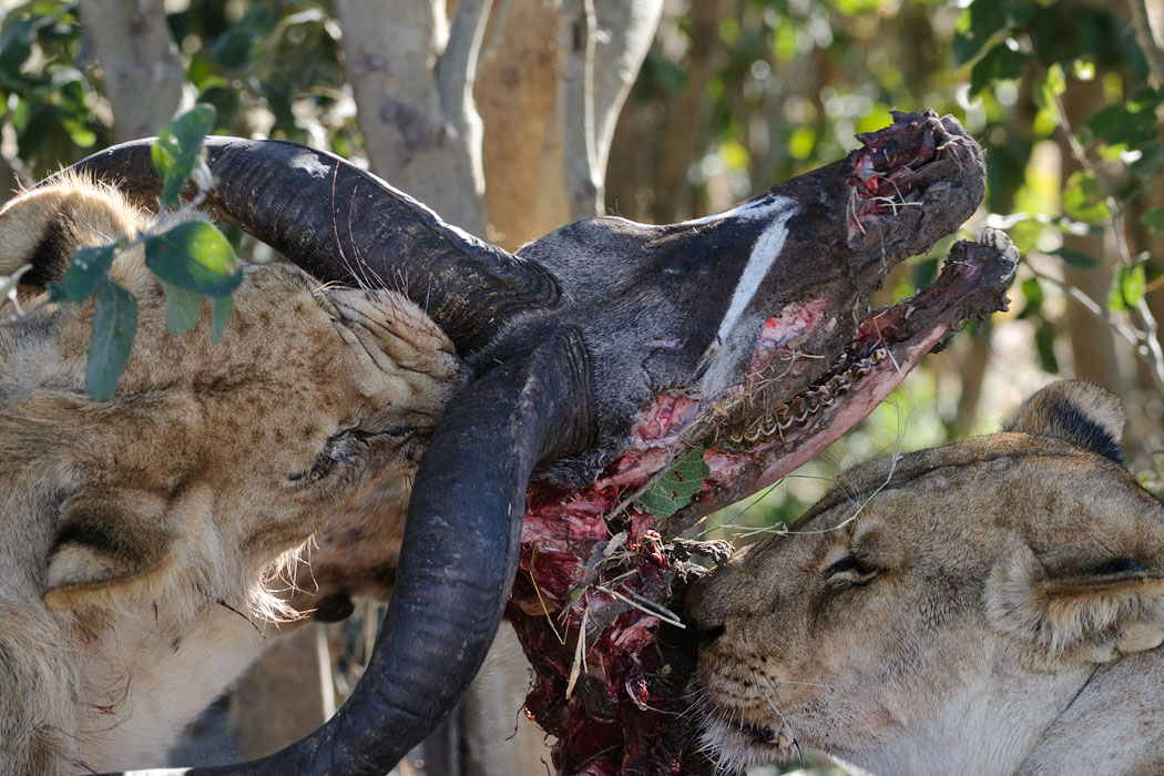 Der Morgendrive führt uns zur selben Stelle. Und tatsächlich sind wieder 3 Löwen da. Die selbe Konstellation wie am Abend zuvor, jedoch andere Tiere. Der Kudu ist schon ziemlich abgenagt und nur der große Löwe darf fressen. Das macht die anderen beiden Tiere unruhig. Besonders der junge Löwe nähert sich immer wieder dem Löwen und wird mit herrischer Geste und Gebrüll verjagt. Er gibt aber nicht auf. Die Sonne scheint malerisch durch das Gebüsch, so dass das Gerippe des Kudus vom Licht durchflutet wird.