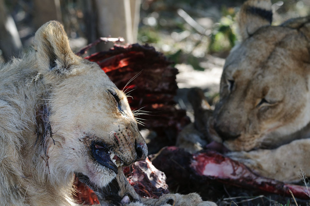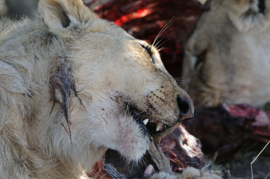 Nach ca. 1 Stunde lässt der Löwe die anderen beiden mit fressen, um kurz danach das Feld zu räumen. Er streckt und putzt sich und trollt sich von dannen. Die anderen beiden zerren und ziehen an den wenigen Resten, die noch da sind. Wir können tolle Fotos machen und besichtigen irgendwann noch kurz die Wasserlöcher in der Umgebung, an denen aufgrund der fortgeschrittenen Zeit aber so gut wie nichts mehr los ist.