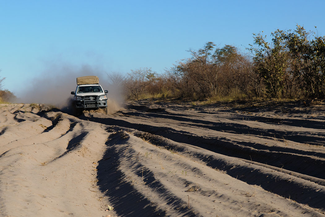 Wir verbinden den morgendlichen Gamedrive mit der Fahrt nach Kasane. Die Strecke ist fast sandiger als der Hinweg. Wir fahren wieder mit Blickkontakt, aber in diesem Jahr ist uns das Glück hold: Keiner bleibt stecken und kein Reifen verabschiedet sich.