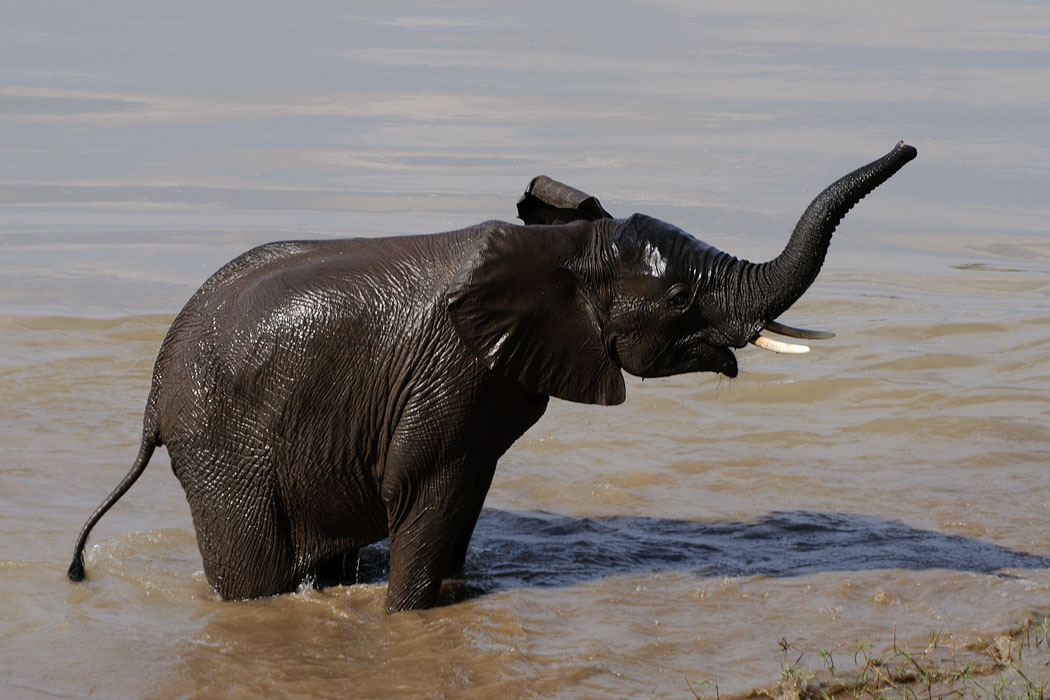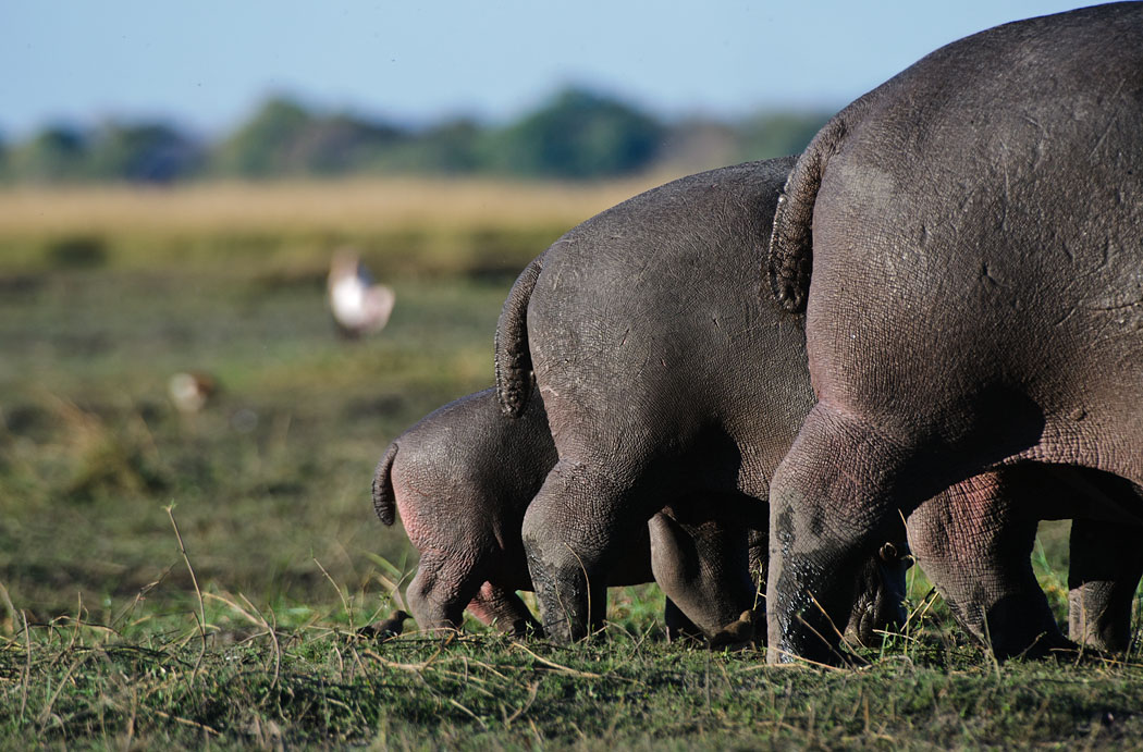 Auf dem Rückweg fahren wir an mehreren Lagunen vorbei, wo sich viele Elefanten tummeln, die Hippos brüllen und die Vögel für uns posieren.