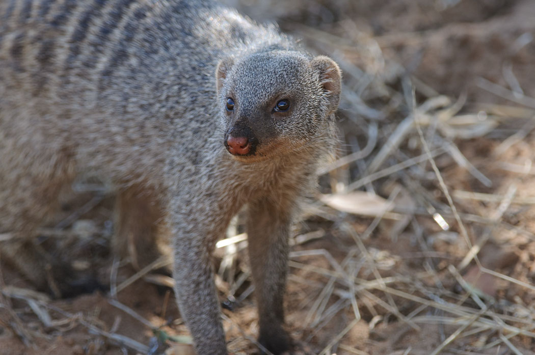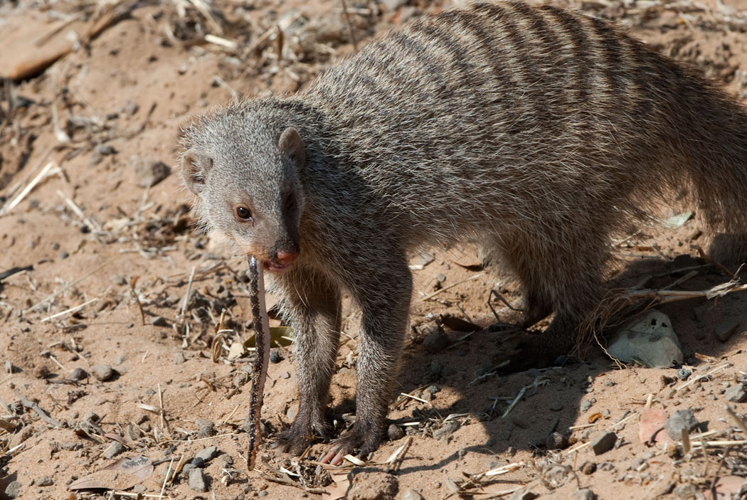 Auf dem Weg zur Ihaha-Campsite sehen wir noch sehr viele Tiere. Sie sind natürlich nicht mehr neu für uns und deshalb nicht mehr ganz so spektakulär. Eine Meute Zebramangusten quert plötzlich die Straße. Das hatten wir noch nie. Diese Tiere sind größer, als ich dachte, und wühlen ununterbrochen in der Erde. Ich erwische eine Manguste dabei, wie sie einen Wurm verspeist und mache davon schöne Bilder. Nach diesem Überfall lebt in der Erde wahrscheinlich kein Käfer, keine Maus und kein Wurm mehr.