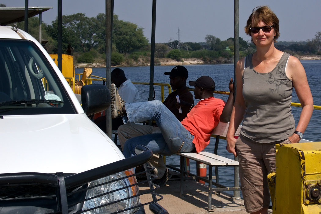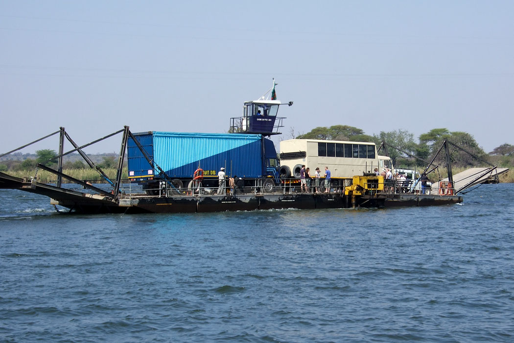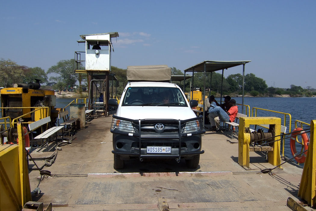 Zügig fahren wir jetzt auf Asphalt zum Grenzübergang nach Sambia. Die botswanischen Behörden lassen uns innerhalb von 20 Minuten durch. Die Warnung: „Zahlen Sie nur im Büro auf der anderen Seite!“ wird uns mit auf den Wege / die Fähre gegeben, die über den Sambesi fährt. Wir müssen an vielen Lkw vorbei und fahren als erste drauf. Sofort steht ein Einheimischer an unserem Fenster und erklärt uns, was wir alles zu bezahlen haben und dass wir dafür dringend Kwatcha brauchen. Wir wimmeln ihn ab, müssen aber die Fähre trotzdem sofort und nicht erst im Büro zahlen. 20 US-Dollar wechseln den Besitzer. Wir bekommen aber eine Quittung und hoffen, dass alles mit rechten Dingen zugeht. Jetzt bekommen wir mit, dass nur unser Auto auf der Fähre ist. Das befremdet ein wenig, denn es standen genug Laster an, die auch noch raufgepasst hätten. Nun, das ist Afrika, man muss nicht alles verstehen.