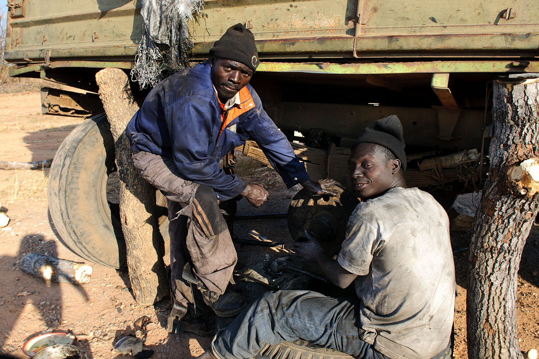 Die Fahrt nach Maun geht schnell, die Toyotawerkstatt ist schnell gefunden. Es kostet etwas Überzeugungskraft, die Mitarbeiter dazu zu animieren, dass unser Auto möglichst sofort repariert werden muss. Uwe tut sein Möglichstes. Während wir warten, gelingt es ihm immerhin schon mal, die Batterie festschrauben zu lassen. Da die Werkstatt offenbar nicht über das richtige Werkzeug verfügt, stellt er dem Mechaniker seinen Leatherman zur Verfügung. Als endlich eine Bühne frei wird, fährt Uwe das Auto dorthin und bespricht mit dem zuständigen Mechaniker, was zu tun ist.