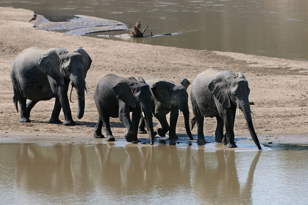 Eine Elefantenherde geht zum Wasser, kehrt um und wandert zielstrebig an unserer Campsite vorbei. Sie schauen nicht links und nicht rechts. Wir halten alle einen Sicherheitsabstand ein. Die Tiere sind eindrucksvoll Energie geladen.