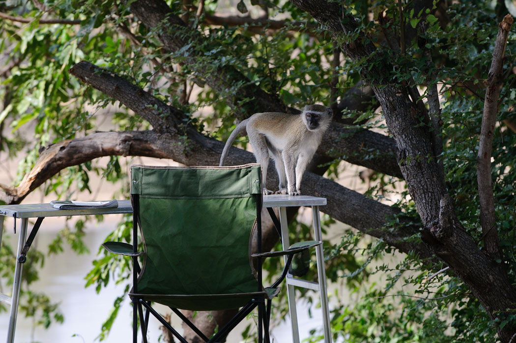 Auf der Camp Site selbst gehen wir nicht auf unseren Platz, da er uns zu sehr unter Bäumen liegt, auf denen offensichtlich die Affen hausen. Wir wählen einen Platz, der weniger Rückzugsraum für diese Tiere bietet, die sehr aufdringlich werden können.