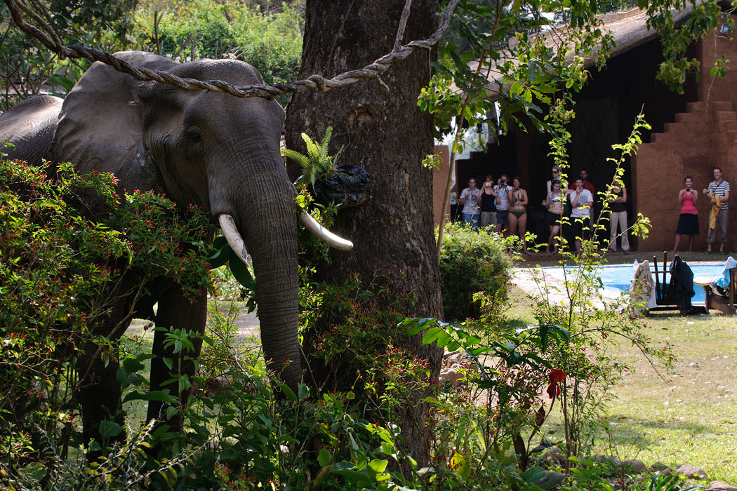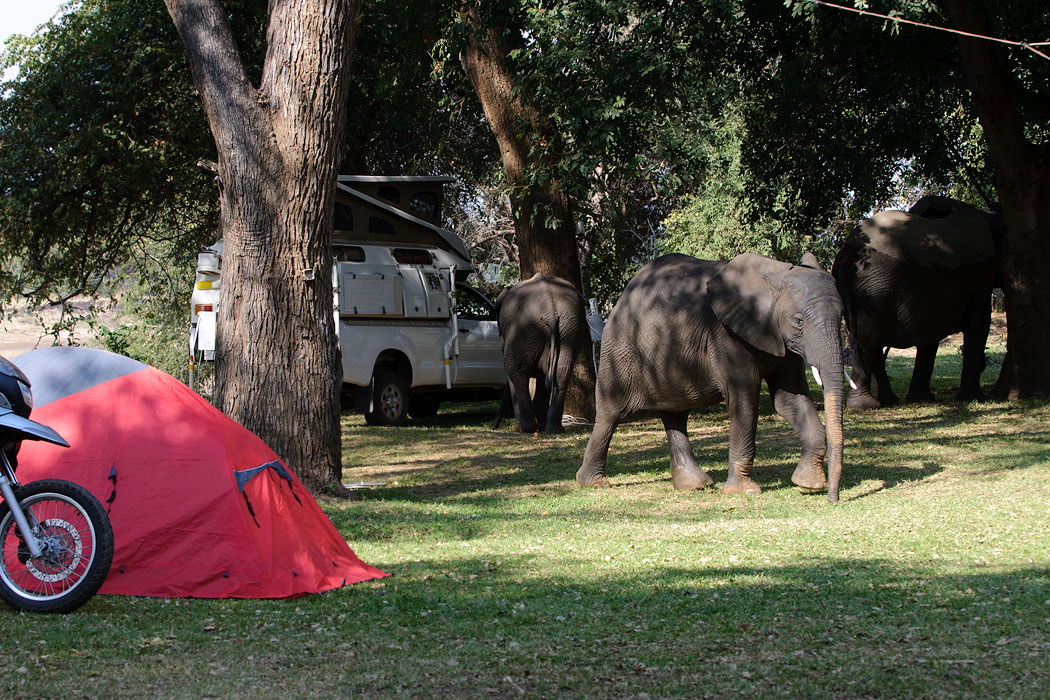 Als ich morgens den Kaffee aufgießen will, sehe ich aus dem Augenwinkel, dass bei den Nachbarn ein Elefant am Baum steht und frisst. Schnell packe ich alles ins Auto, als auch Uwe von der Toilette kommt, und gemeinsam warten wir den Run der Elefanten über das Gelände ab. Als sie weg sind, gehe ich zur Toilette und als ich wieder komme, treffe ich den Besitzer und wir vergewissern uns, dass die Tiere wirklich nicht mehr da sind. In diesem Moment höre ich lautes Elefantentrompeten und sehe, wie ein kleiner Elefant schnurstracks über den Zeltplatz rennt und diese Geräusche von sich gibt. Schnell springe ich hinter einen Pfeiler, denn das Tier schaut nicht rechts und nicht links. Es stolpert fast über einen Baumstamm, der als Abtrennung auf der Erde legt. Er hat wohl Angst, dass er seine Mutter verliert.