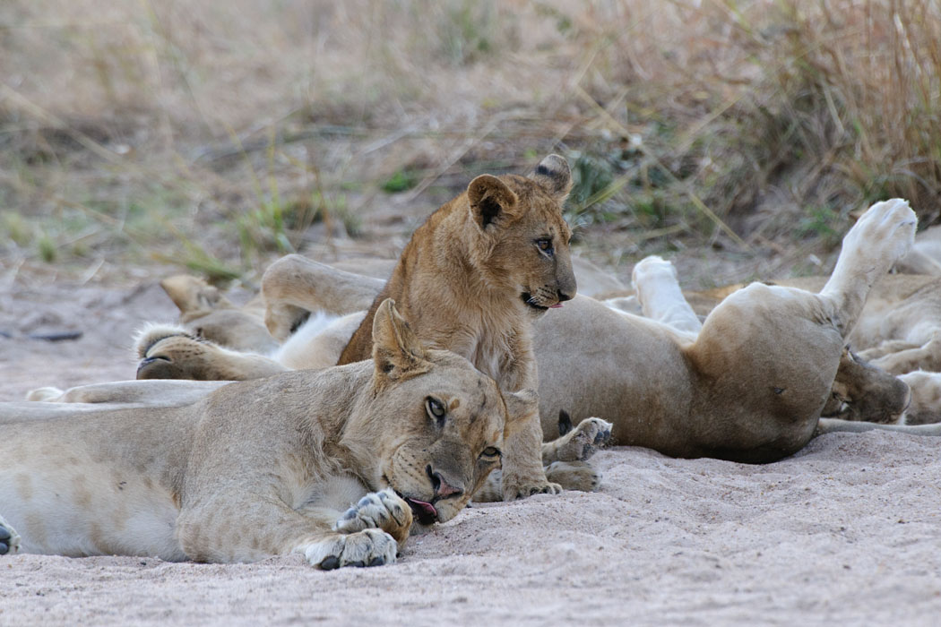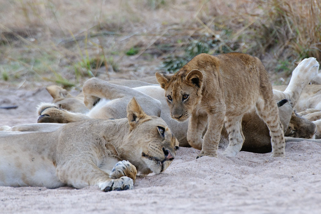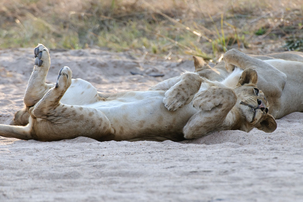 Nachmittags machen Uwe und ich einen Gamedrive zu den schlafenden Löwen. Auch hier müssen wir wieder durch einen Fluss fahren. Nach den guten Erfahrungen vom Vormittag sind wir mutig und haben wieder Glück. Die Löwen liegen dann irgendwann direkt vor uns. Ohne das Touristenauto hätten wir sie nicht gesehen, so gut sind sie getarnt.
