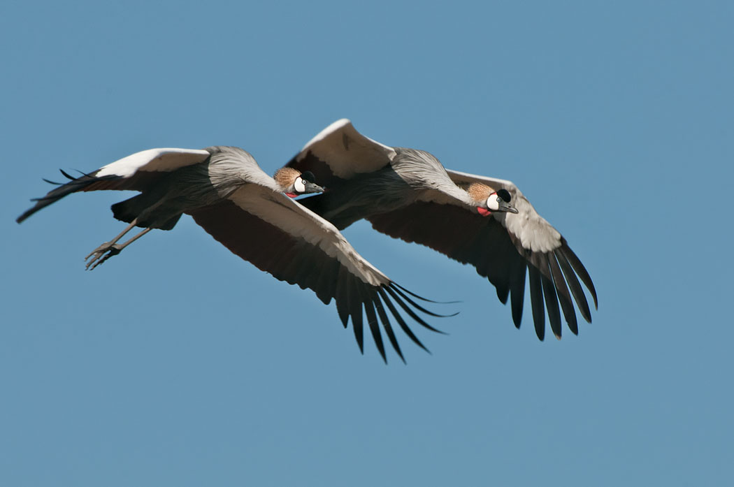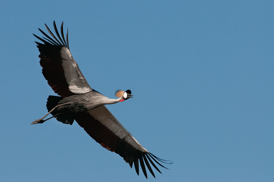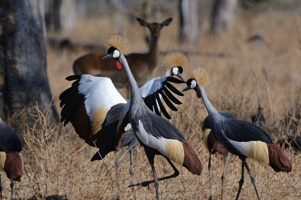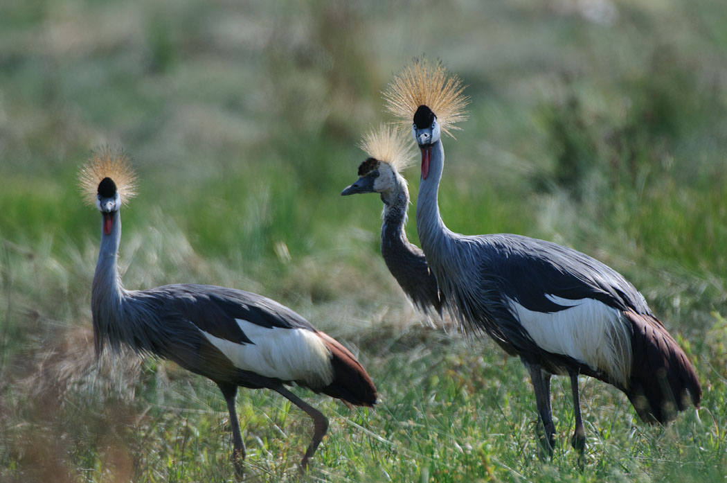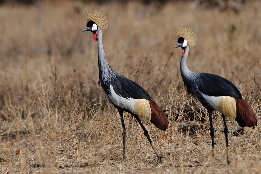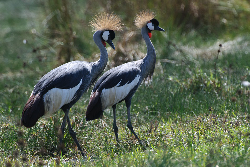 Wir wollen zur heißen Quelle, denn in ihrer Nähe soll es besonders viele schöne Vögel geben. Aus dem Weg dorthin entdecken wir die ersten Kronenkraniche. Leider sind sie sehr scheu. Sie fliegen vor dem Auto weg und auch ein einzelner Mensch macht ihnen schnell Angst.
