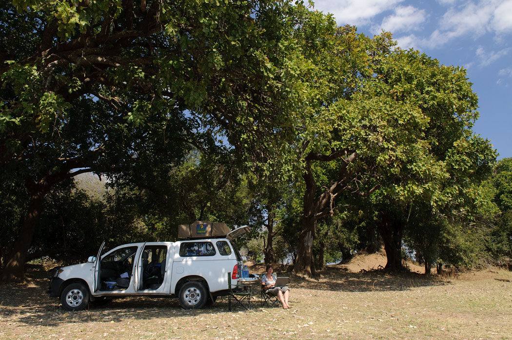 | Etwa später treffen wir einen Geländewagen, in dem ein Holländer mit einer jungen Schwarzen und einem bewaffneten Guide sitzen. Die drei erforschen die Anzahl der männlichen Löwen. Die Jagd ist in Sambia ein einträgliches Geschäft, so dass die Lodgebesitzer, die an der Jagd verdienen, behaupten, es gäbe unendlich viele männliche Löwen. Für einen geschossenen Löwen muss der Jäger ca. 7500 US Dollar als Jagdprämie zahlen. An dieser Stelle wollen die Forscher ansetzen und den realen Löwenbestand ermitteln. Wir folgen ihnen, als sie mit einer Peilantenne auf Löwenjagd gehen. Sie entdecken tatsächlich drei Löwinnen im Gebüsch. Dort dürfen wir nicht hinfahren. Nach einiger Zeit fährt sich das Forscherauto fest. Die Löwinnen sind natürlich schon im Gebüsch verschwunden. Wir können den Dreien nicht helfen und sie haben für alle Fälle Funk, so dass wir in Richtung des Flusses weiter fahren. Wir nehmen den einen oder anderen Loop und suchen uns dann ein schattiges Plätzchen unter Bäumen, wo wir unsere Mittagspause machen.