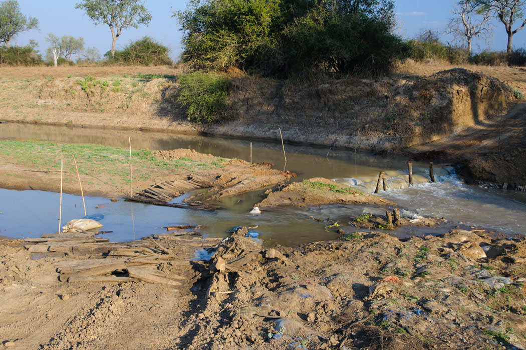 Als wir uns auf den Rückweg machen, stehen wir plötzlich vor einer Flussdruchfahrt, bei der ich gar kein gutes Gefühl habe. Man sieht eindeutig LKW-Spuren, die die Sandsäcke auseinander gefahren und die Bretter zum Abbrechen gebracht haben. Die zweite Hälfte der Durchfahrt wird von einem Fluss gequert, der eine sehr hohe Strömungsgeschwindigkeit hat.