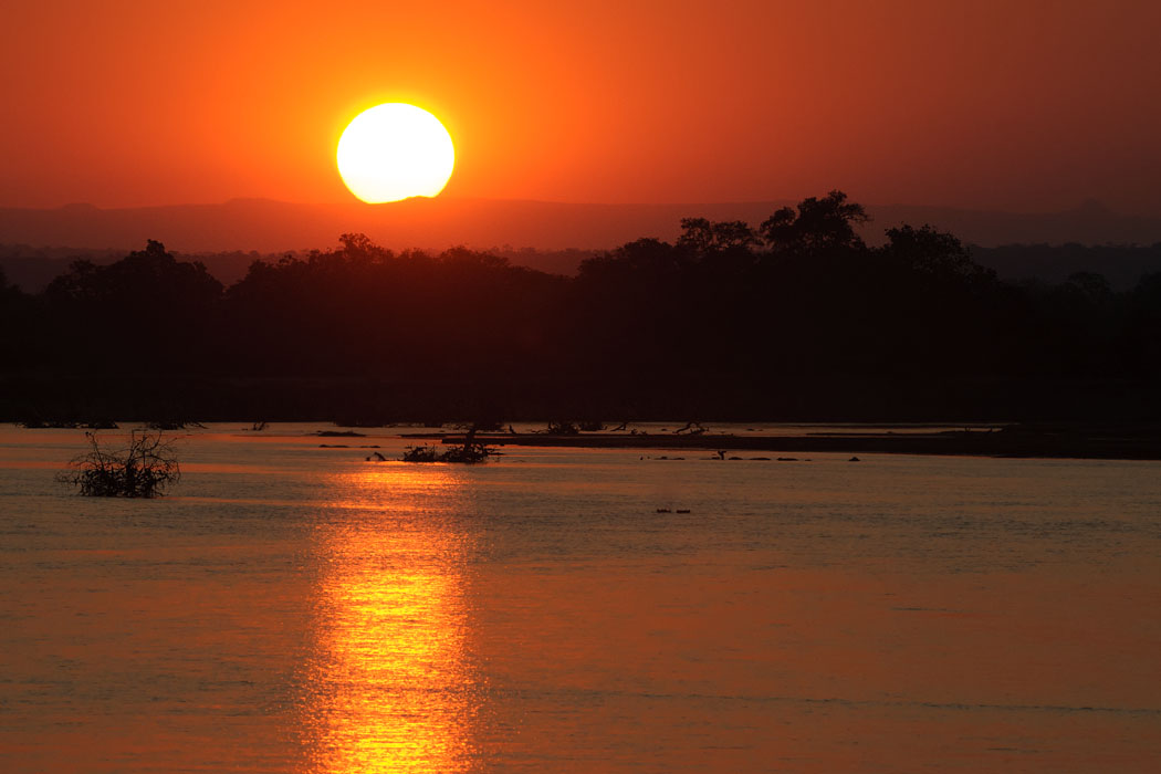 Der Rest der Fahrt verläuft störungsfrei und wir erleben den Sonnenuntergang auf dem Wildlife Camp, das uns auch gefällt. Es ist ebenfalls schön angelegt und liegt direkt am Fluss. Der Sonnenuntergang ist hier eindeutig schöner als auf unserem Platz, dafür stehen wir dort auf Sand.