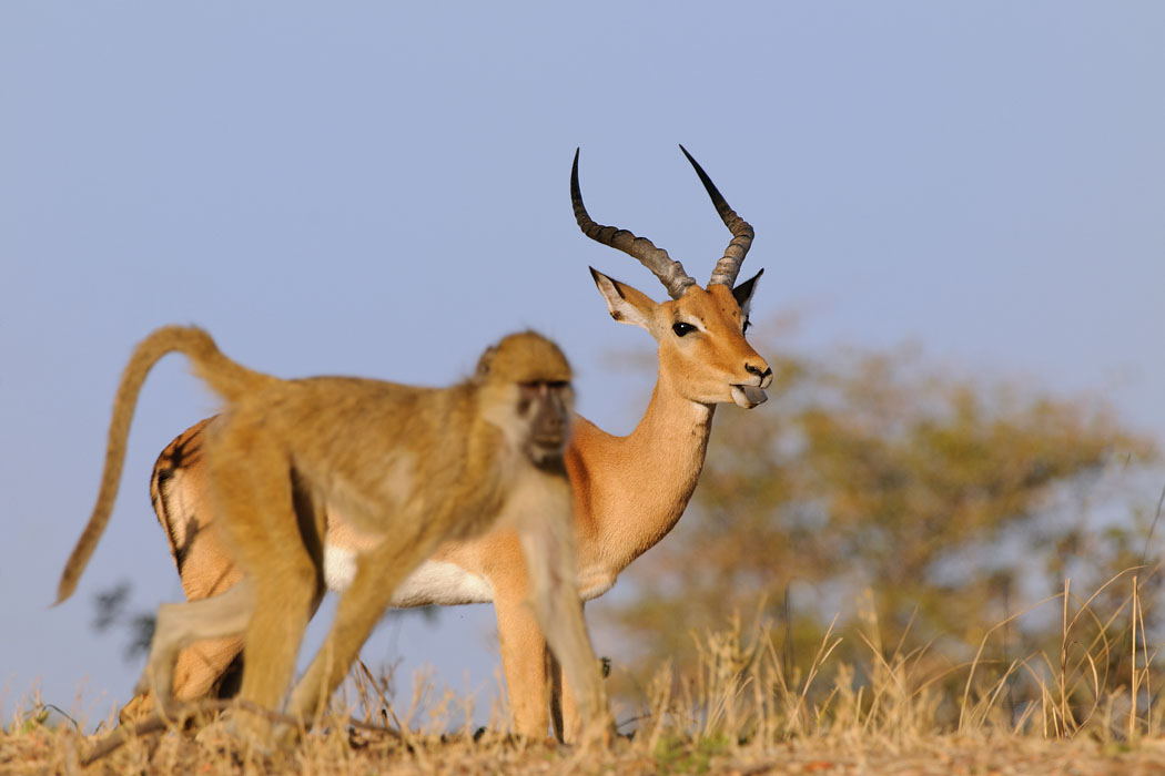 Später fahren wir noch viele Loops am Fluss entlang. Aber weder ein Löwe noch ein Leopard will mit uns Kontakt aufnehmen. So beobachten wir die Vogelschwärme, die in beeindruckenden Formationen von einem Baum zum anderen fliegen. Sie sind so schnell, dass man sie unmöglich auf ein Foto bannen kann. Viele Impalas und Pukus sind auch unterwegs und unsere Freunde die Affen toben ebenfalls durch den Wald.