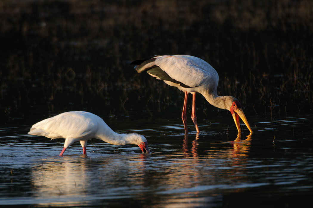 Wir fahren weiter und weiter und sehen wie immer viele Tiere. Auch unsere Münchener Nachbarn treffen wir, die diesmal aber auch keine Löwen gesehen haben. Kurz vor Sonnenuntergang bleiben wir bei einigen Vögeln stehen. Der Nimmersatt steht stoisch in der Gegend rum, während der Afrikanische Löffler wie wild nach Nahrung sucht. Das sieht immer sehr lustig aus, denn er flitzt, mit dem Schnabel im Wasser wühlend, hin und her.