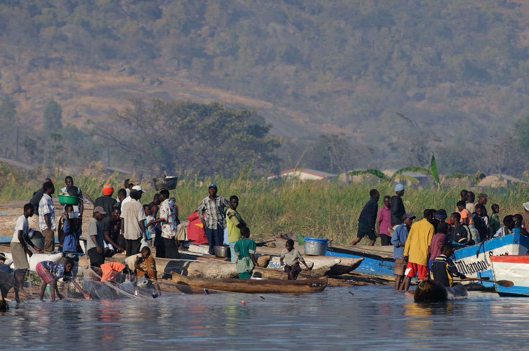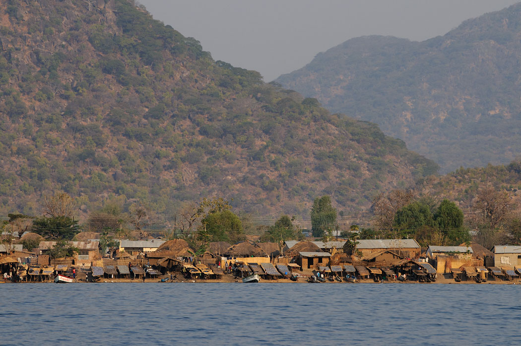 Dort machen wir uns Pancakes und begeben uns dann auf einen Spaziergang durch das Dorf. Als wir 2 Tage vorher ankamen, waren die Straßen voll mit Menschen und kleinen Marktständen. Es wuselte und lebte überall. So sind wir überrascht, dass die Straßen jetzt relativ leer sind. Zwar spielen viele Kinder, aber es ist trotzdem ruhig und überschaubar. Die Hütten stehen dicht an dicht, sind aber von außen zumindest, gepflegt und Müll liegt nur an wenigen Stellen herum. Eigentlich nicht viel anders als bei uns. Natürlich leben die Menschen auf einem völlig anderen Niveau. In Malawi gehen nur 50 % der Kinder in die Schule. Die Bevölkerung besteht aus 50% Kindern unter 15 Jahren. Das sieht man hier auch. Ein Kind kommt selten allein, meist sind es kleine Gruppen von 4 bis 8 Kindern. Es hängen aber auch Gruppen von Frauen mit Babys auf der Straße herum. Großmütter oder –väter sieht man nur selten. Wir werden auch immer wieder angesprochen, ob wir etwas kaufen wollen. Wenn wir freundlich ablehnen, bedanken sich die Männer und lassen uns in Ruhe. Wir gehen durch viele Häuserreihen an den Strand.