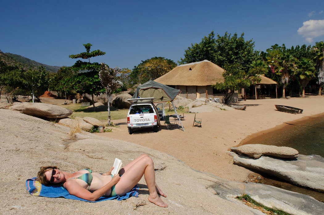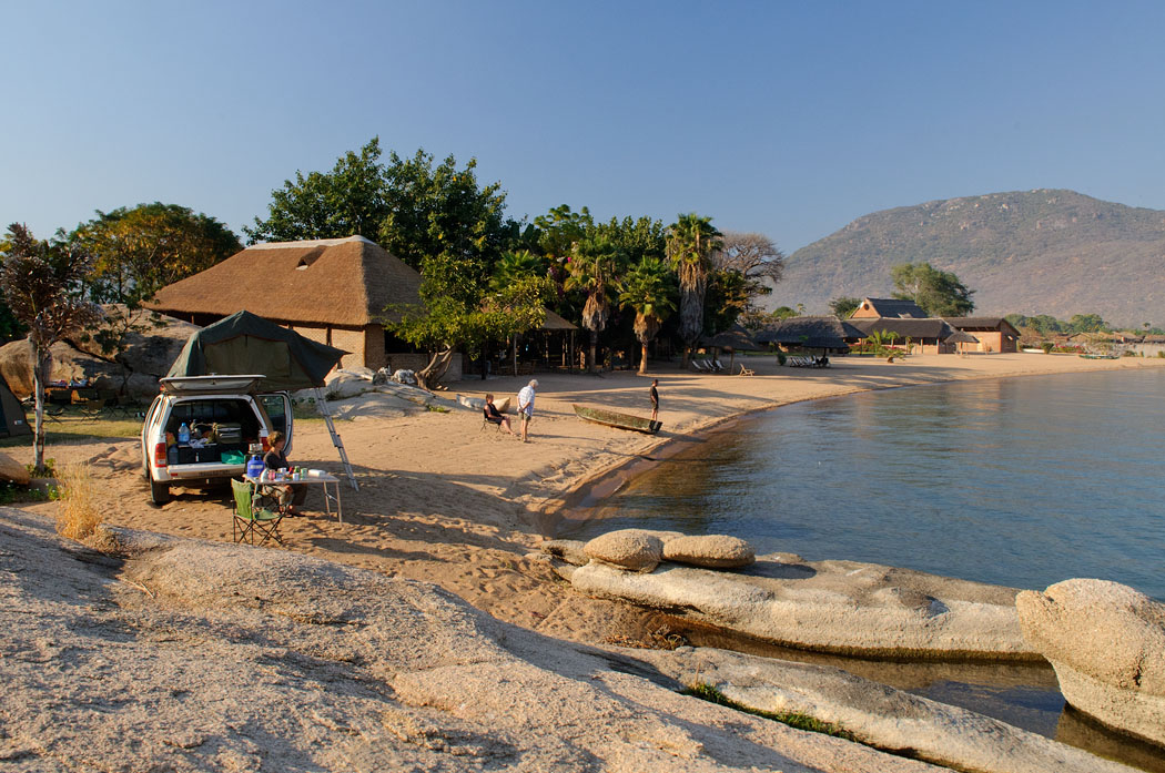 | Auch die Straße nach Monkey-Bay ist geteert. Wir haben wirklich Glück. Es wird langsam dunkel und wir kommen trotzdem gut voran. Erst als der Nationalpark vor dem See beginnt, wird die Straße sandig und wellblechig. Die 18 km bis zum Eagle’s Nest überstehen wir schaukelnd. Endlich dort angekommen, weist uns der Kellner einen Platz zu, der ein wenig wie eine Schulhof wirkt und weit über dem eigentlichen Platz ist. Dieser ist von dem roten Overlander zugeparkt, den wir schon im Bridge Camp getroffen haben. Uwe schaut sich das Ganze an und bittet dann die Gruppe ein Zelt zu versetzen, damit wir am Strand parken können. Wir immer sind die Leute sehr hilfsbereit und bald haben wir einen superschönen Platz direkt am See. Wie schön es hier ist, können wir an diesem Abend nicht sehen, denn es ist stockdunkel.