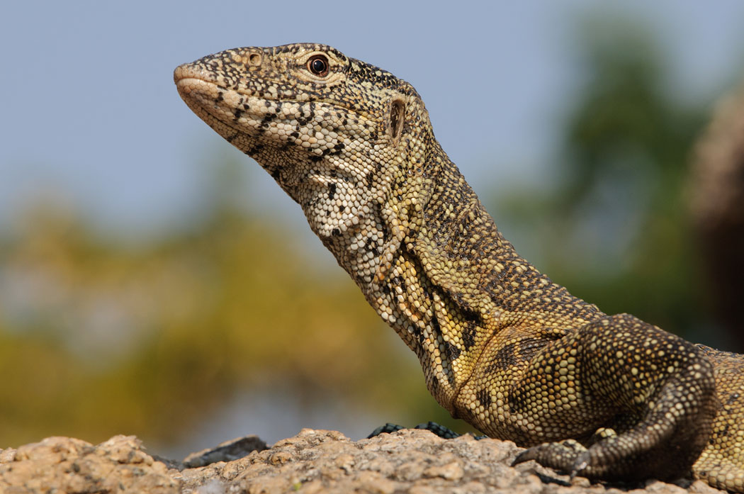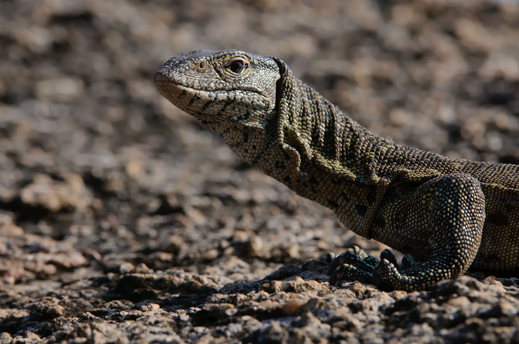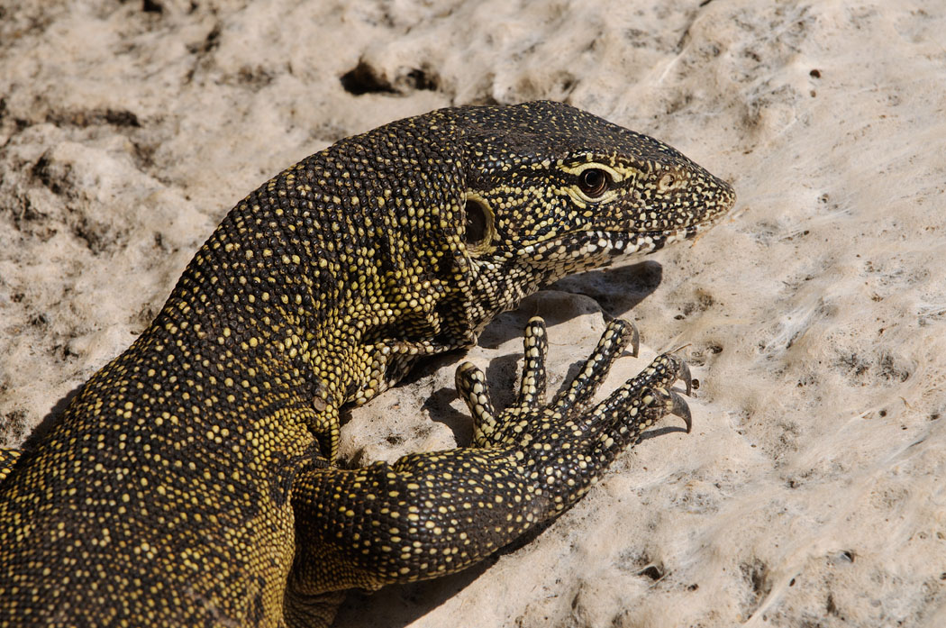Ein Waran spaziert direkt vor unseren Augen auf dem Felsen entlang. Er lässt sich auch vom Fotografieren nicht sonderlich beeindrucken. Eine Zeit lang versteckt er sich unter einem Felsen, kommt aber bald wieder zum Vorschein. Er ist viel kleiner als der, den wir am Chobe vor 2 Jahren beobachtet haben. Entweder handelt sich um eine andere Art oder er ist noch jung.