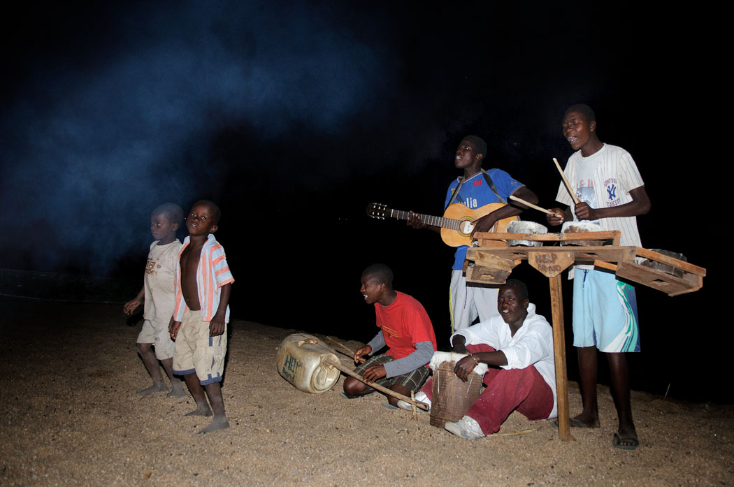 Nachdem wir den ganzen Tag wirklich vergammelt haben, freut es uns, dass der Fisch tatsächlich um 19.00 Uhr fertig ist. Dazu gibt es Kartoffeln und Tomaten als Soße und Reis als Beilage. Zum Nachtisch gibt es die leckeren kleinen Bananen. Alle sitzen im Kreis um das Feuer herum und essen. Als die meisten fertig sind, beginnt die Band, bestehend aus 4 Männern, zu spielen. Einer hat eine Gitarre, ein anderer eine Gembe, eine Konga und ein selbstgebasteltes Instrument, dessen Klangkörper aus einem alten Plastikkanister besteht und dessen Saiten aus normalem Draht sind. Dazu tanzen zwei vielleicht 8jährige Jungen. Sie zucken und bewegen ihre Hüften. Die Musik ist anfangs ganz nett, wenn auch nicht so wirklich afrikanisch. Die Texte sind meist auf Englisch. Mit der Zeit wird alles etwas eintönig, da die Rhythmen nicht so oft wechseln. Nachdem der Plastiktopf in der Mitte von fast jedem Gast bedient wurde und die ersten bereits ins Bett gegangen sind, hörten sie dann netter Weise auf uns zu beglücken. Der Tanz der Kinder wirkte nicht besonders ansprechend. Ich denke, das sollten sie aus dem Programm nehmen.