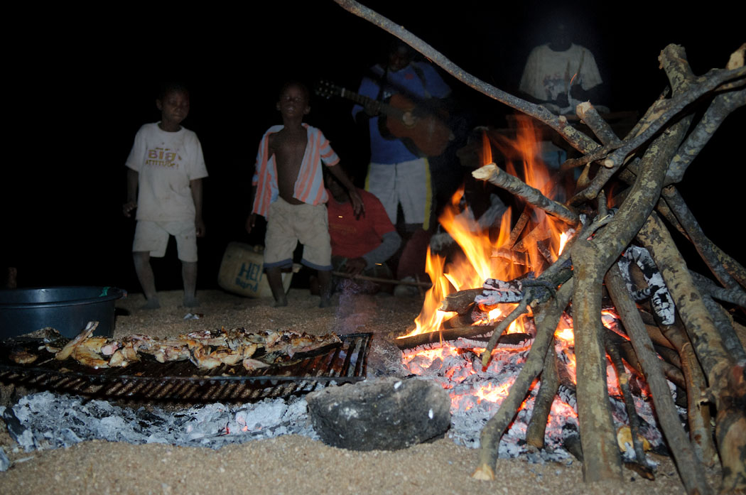 Da die Overlandergruppe den Katamaran gebucht hat, bleiben wir heute am Strand und genießen in Ruhe ein Frühstück ohne Hetze. Wir lesen, schreiben, baden…. Die Overlander fragen uns, ob wir am Abend mit ihnen zusammen Fisch essen wollen. Einheimische aus dem Dorf werden ihn am Strand zubereiten und es gibt dazu Musik von einer Gruppe Afrikaner.
