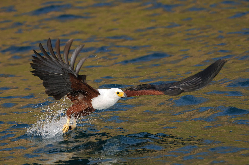 Um 7.00 Uhr steigen wir das erste Mal auf den Katamaran. Wir fahren zur gegenüberliegenden Insel. Dort sieht man schon von weitem die Schreiseeadler in den Bäumen sitzen oder über der Insel kreisen. Der Bootsführer nimmt einen Fisch, gibt pfeifende Töne von sich, winkt mit dem Fisch und wirft ihn ins Wasser. Je nachdem, wie die Vögel Hunger oder Lust haben, schwingt sich ein Vogel auf, um den Fisch aus dem Wasser zu fischen. Uwe und ich probieren, sie dabei möglichst eindrucksvoll zu fotografieren. Wir fokussieren auf den Fisch im Wasser und der Bootsführer sagt uns, wann der Vogel kommt. Zum Schluss zählt er bis drei und dann greift sich der Vogel den Fisch. Mit dieser Methode sind wir aber nur begrenzt erfolgreich. Viele Bilder sind unscharf oder bilden wunderbar das spritzende Wasser ab.